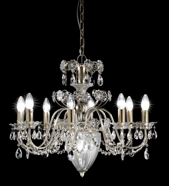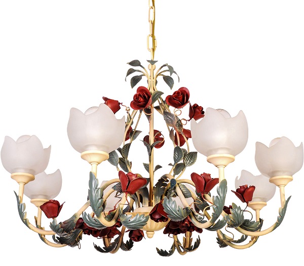 Примером такой кропотливой работы служит подвесная люстра 5555/8. Её дизайн представляет собой композицию из кованых элементов, напоминающих листья и цветы, в сочетании с матовыми стеклянными плафонами.