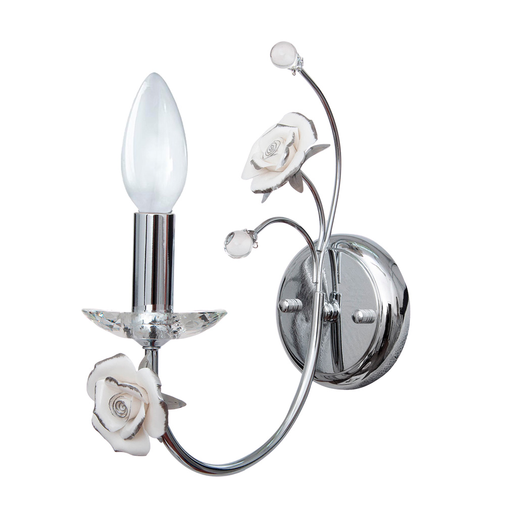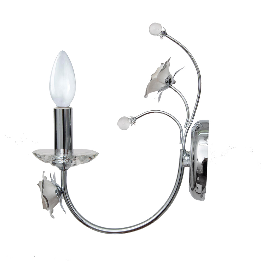 Бра Abrasax 2031/1(chrome) — это не просто источник света, а настоящая ода элегантности, заключенная в хром и благородный фарфор. Представьте, как в вашем интерьере расцветает утонченный букет: от сияющей, зеркальной основы бра отходят четыре изящных, словно живых, стебля. Нижний стержень бережно держит лампу-свечу, у подножия которой расположилась прозрачная стеклянная чаша. Она переливается и дробит свет на тысячи мягких бликов, создавая вокруг теплую, живую атмосферу.