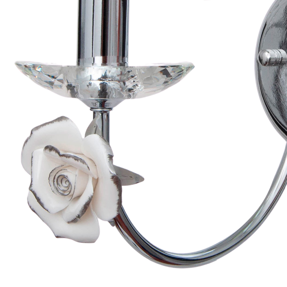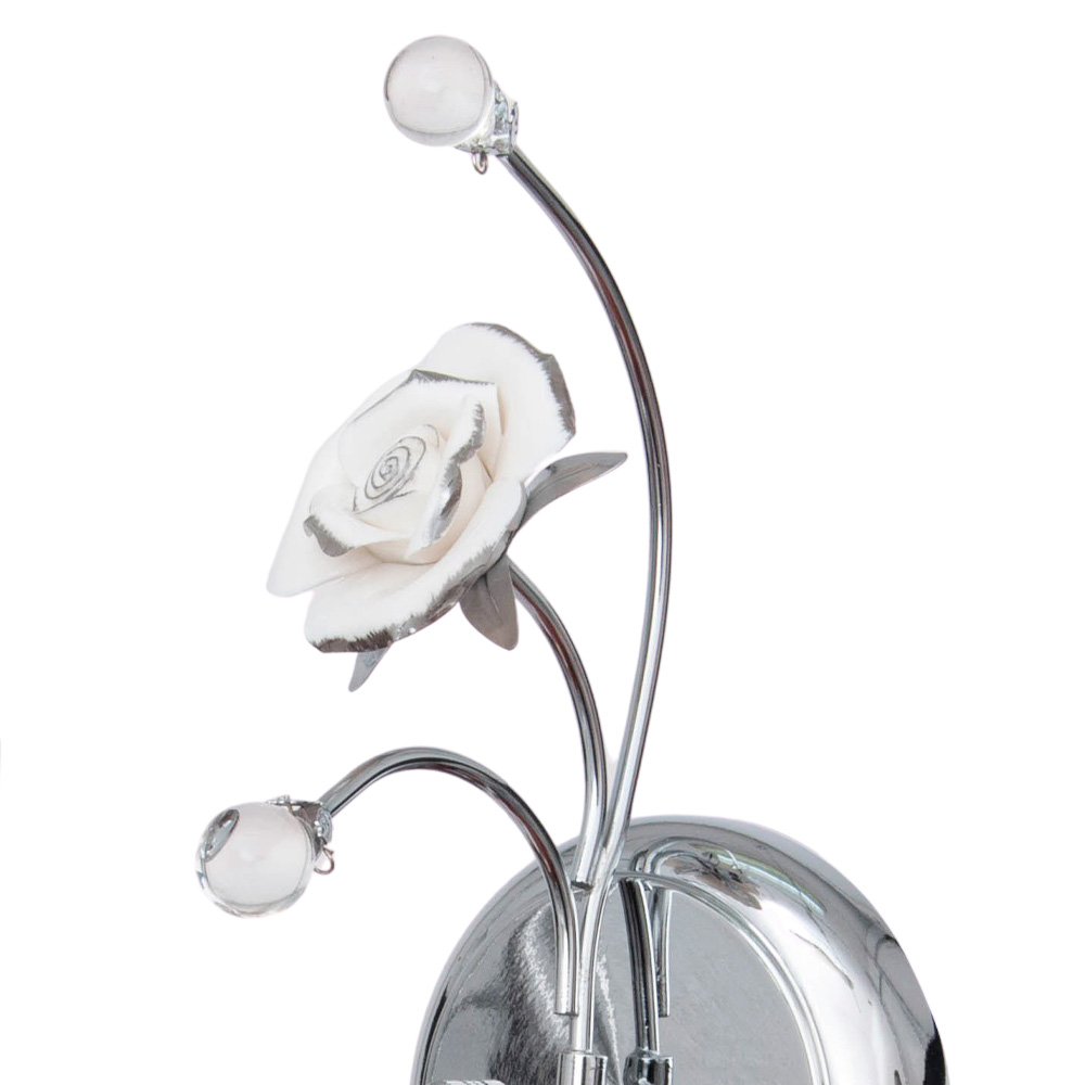 Но главное очарование скрыто наверху: три металлические ветви украшены стеклянными бутонами и белоснежной фарфоровой розой. Её фарфоровая текстура настолько реалистична, что кажется, будто она источает тонкий аромат. Это изысканное сочетание холодного блеска хрома и хрупкой красоты цветов превращает светильник в ювелирное украшение вашей комнаты.