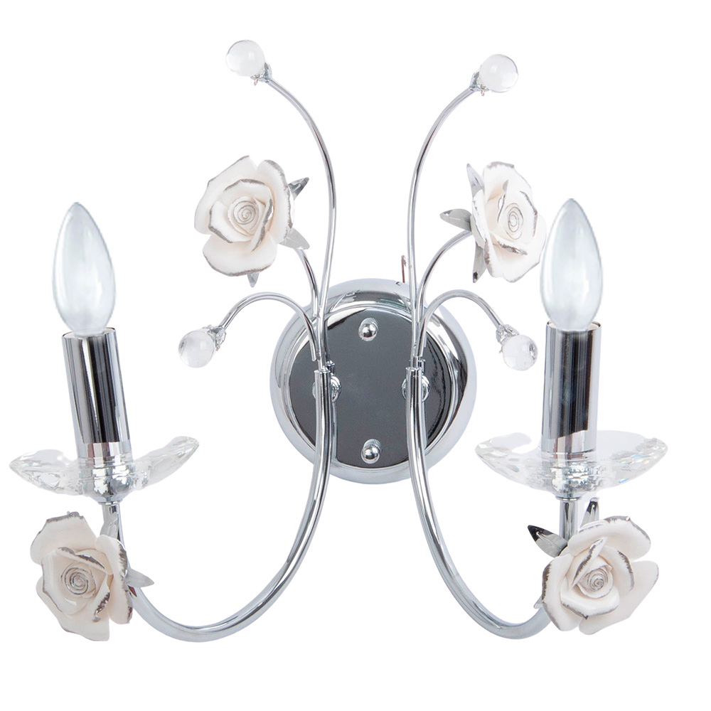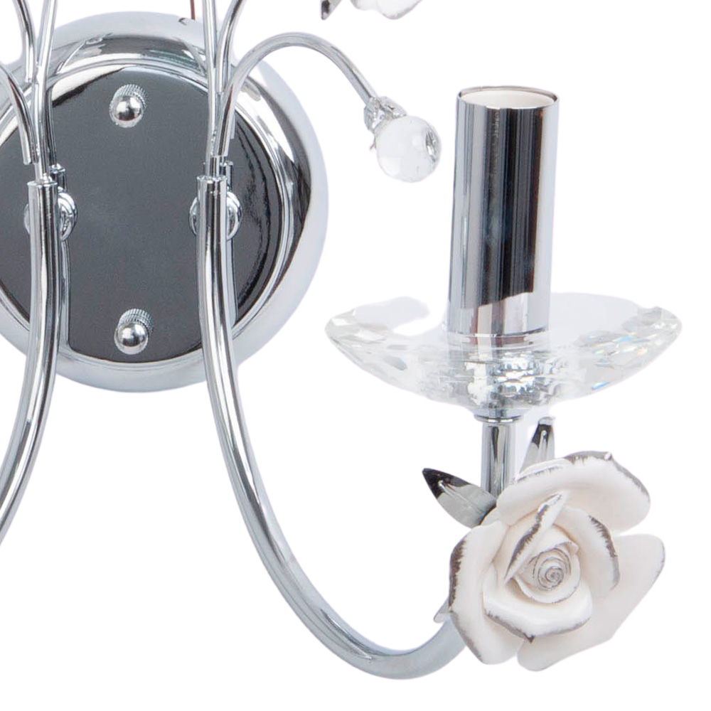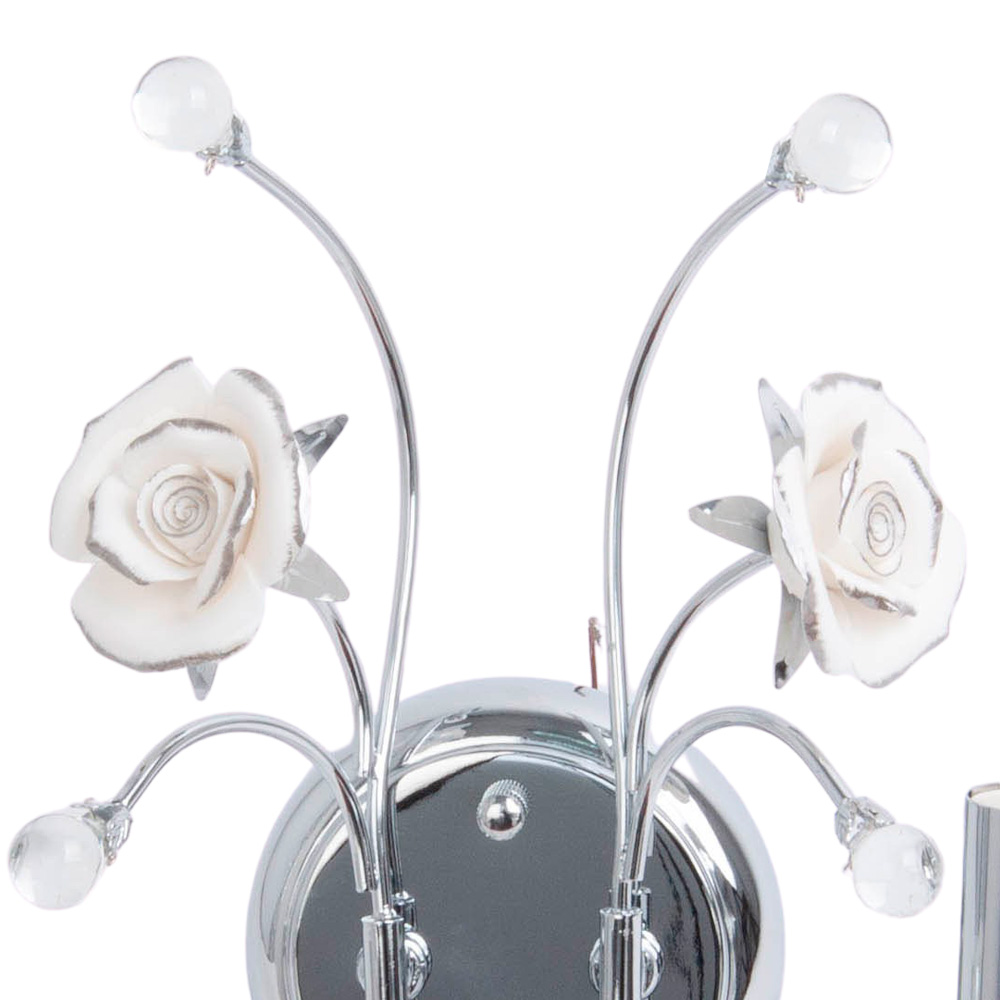 Но главное очарование скрыто наверху: две металлические ветви украшены бутонами и белоснежными розами. Их фарфоровая текстура настолько реалистична, что кажется, будто они источают тонкий аромат. Это изысканное сочетание холодного блеска хрома и хрупкой красоты цветов превращает светильник в ювелирное украшение вашей комнаты.