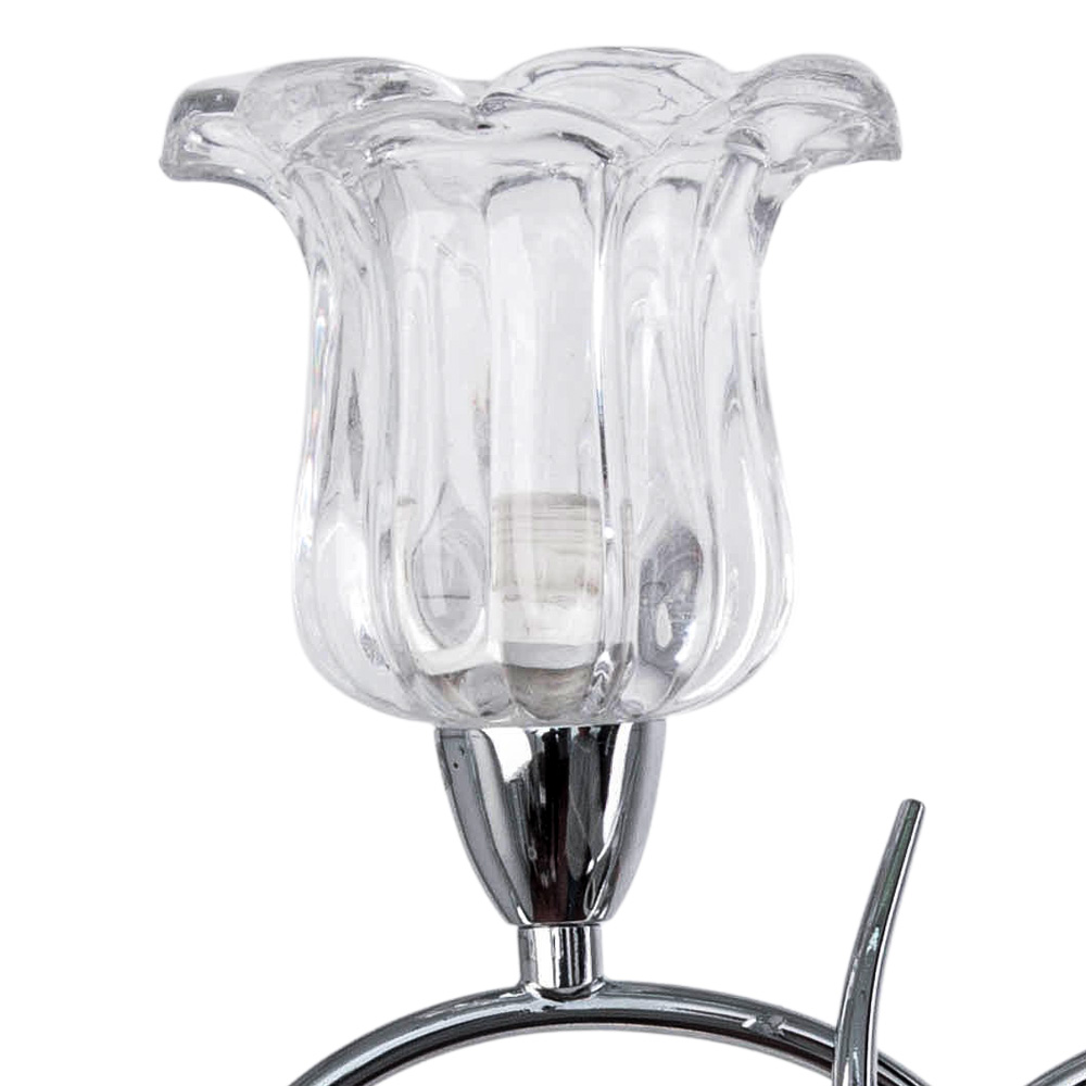 Его металлический корпус, покрытый зеркальным хромированием, — это не просто дань прочности, а рамка для света, играющего на его гранях. Прозрачный стеклянный плафон, подобный лепестку, мягко рассеивает поток, наполняя пространство не освещением, а атмосферой — теплой, уютной и невероятно утонченной.