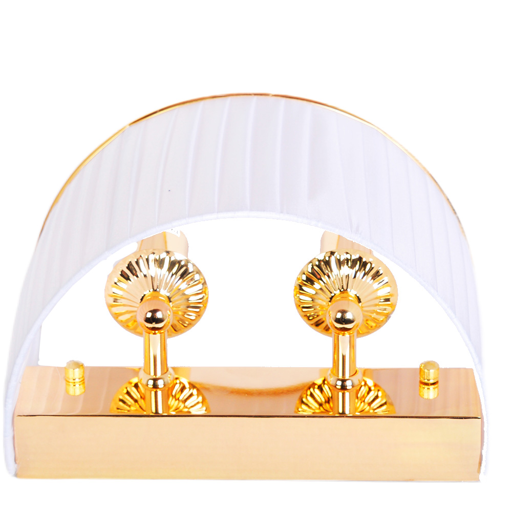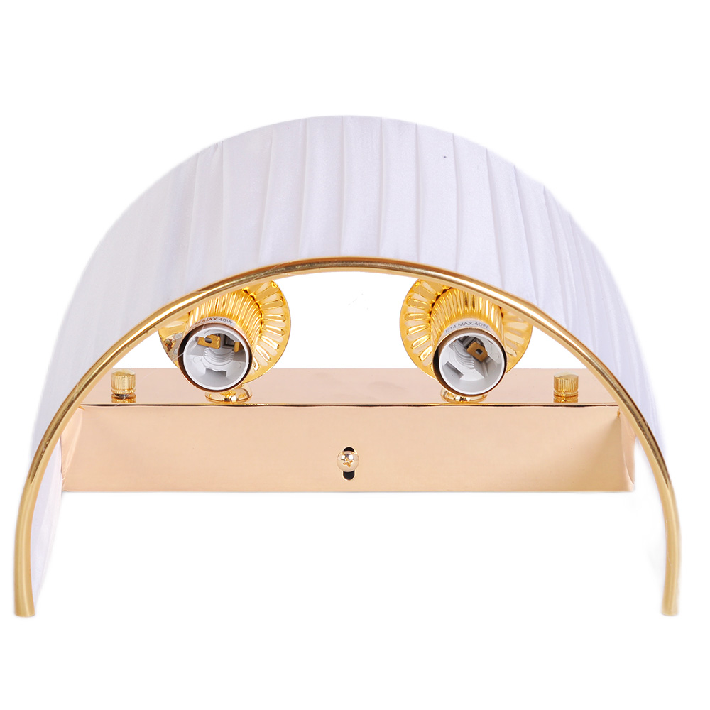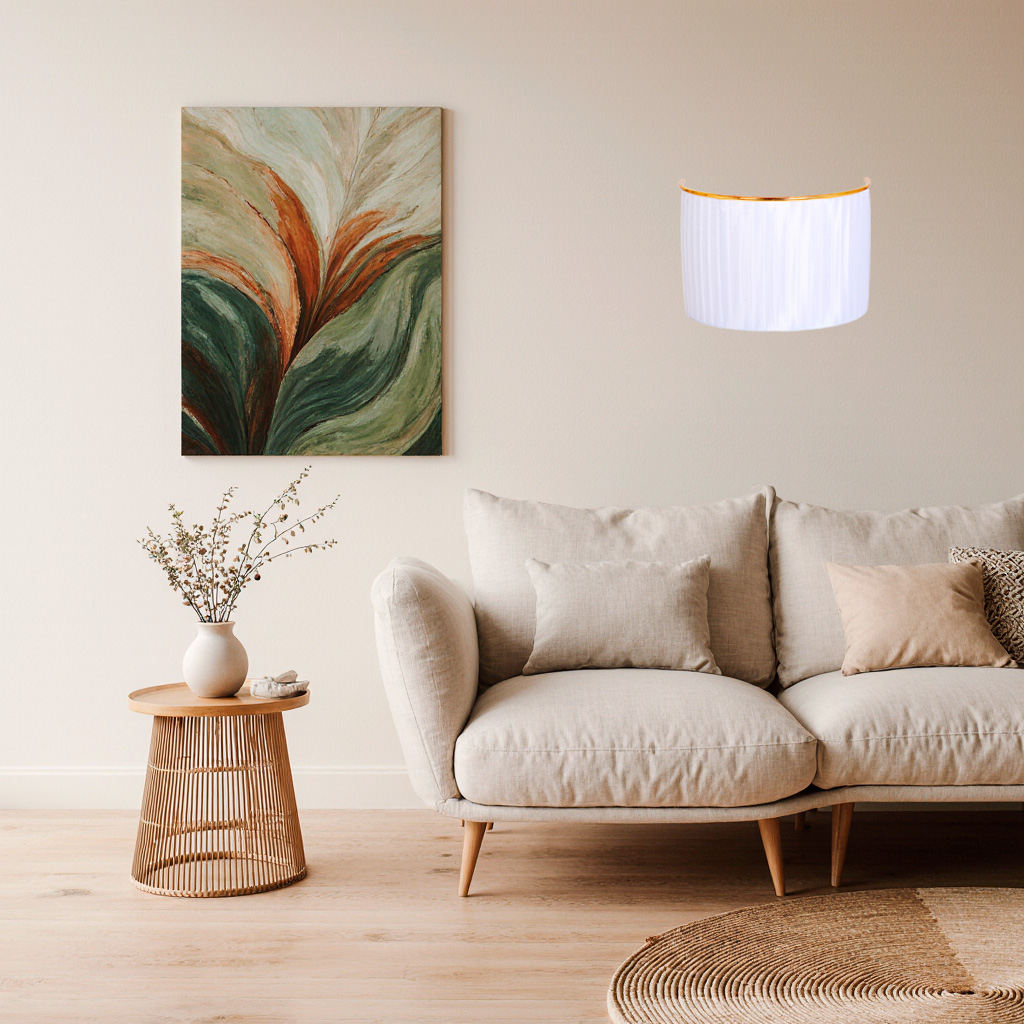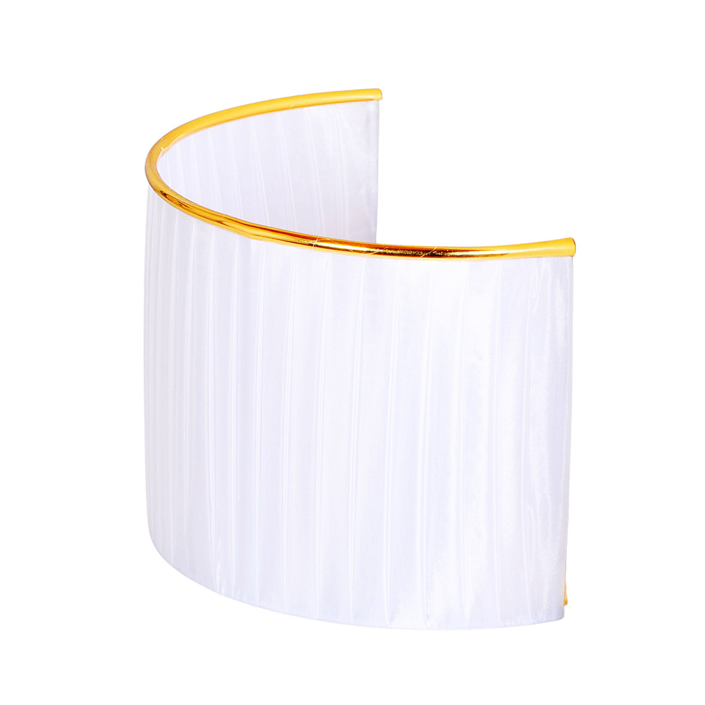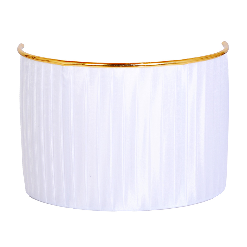 Его форма, напоминающая нежный полукруг, обтянута белоснежной тканью с едва уловимой вертикальной штриховкой, играющей тенями и создающей удивительный объем. Изысканным финальным аккордом сияет тонкая кайма из позолоты, обрамляющая силуэт, — деталь, которая превращает бра в ювелирное украшение для стены.