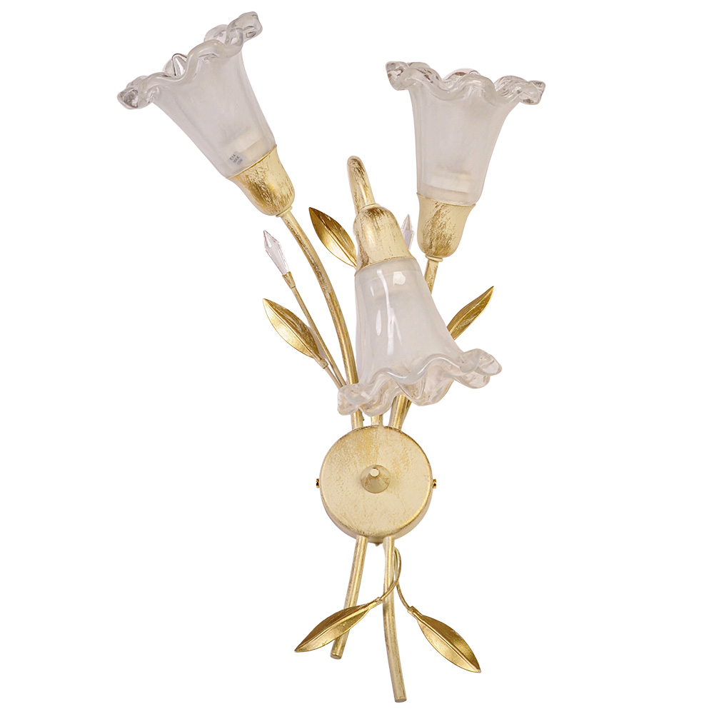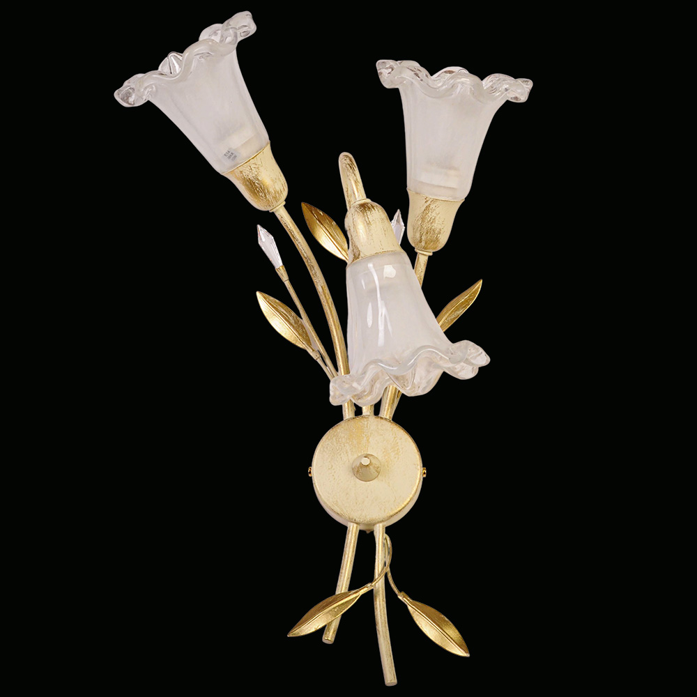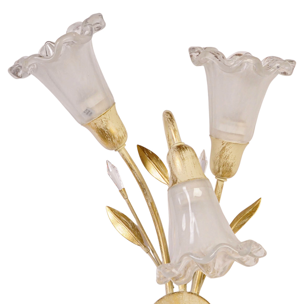 Итальянские мастера воплотили в нём мгновение весеннего расцвета: тончайшие стебли и листья из позолоченного металла замерли в изящном изгибе, а три прозрачных плафона, подобно нежным лепесткам, ловят и мягко рассеивают свет. Каждый декоративный штрих на стекле — это след искусства, делающий бра уникальным.