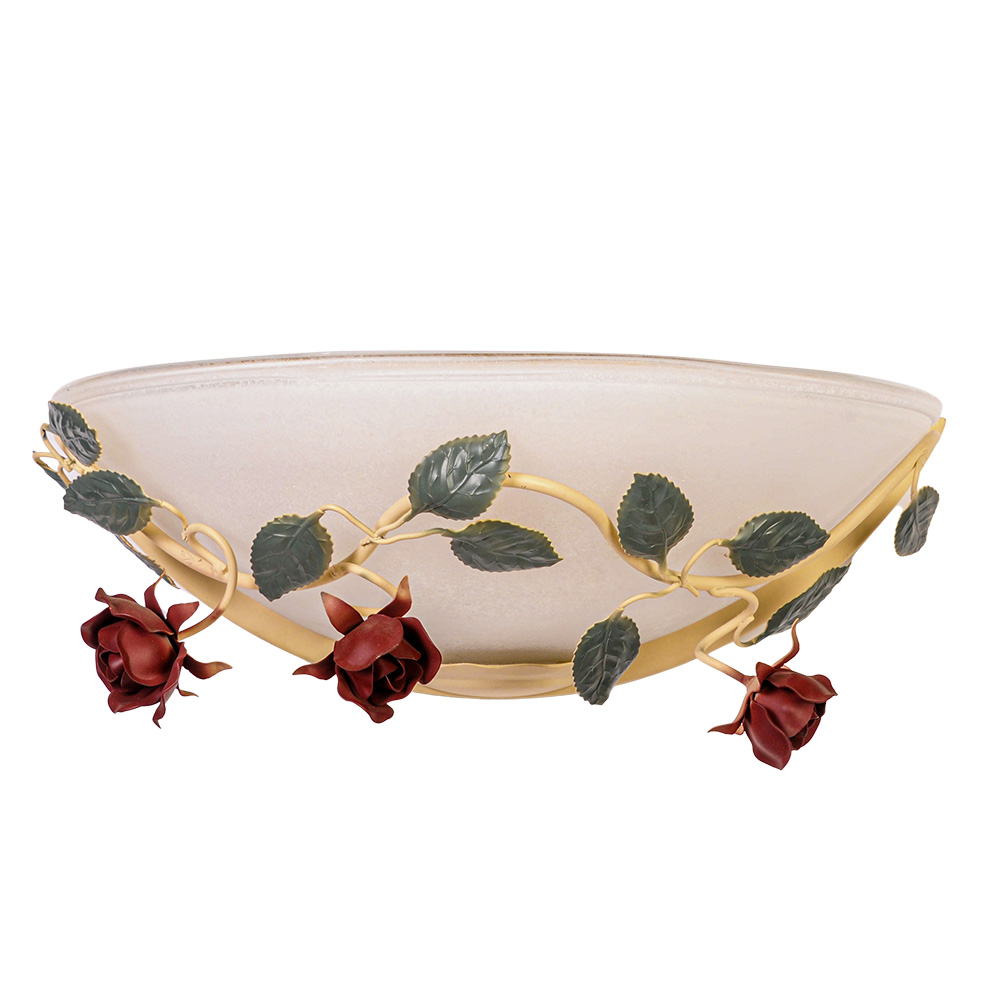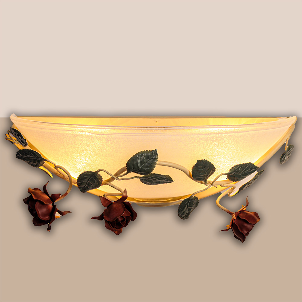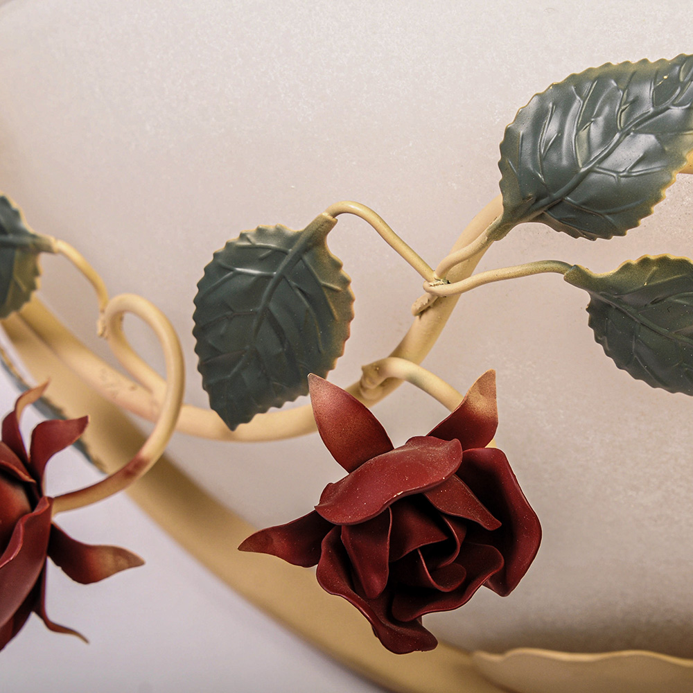 Но главное сокровище этого бра — три объемные розы темно-бардового оттенка, застывшие в роскошном цветении. Каждая роза, выполненная из тончайшего стекла, окружена кружевом реалистичных зеленых листьев, проработанных до мельчайших прожилок.