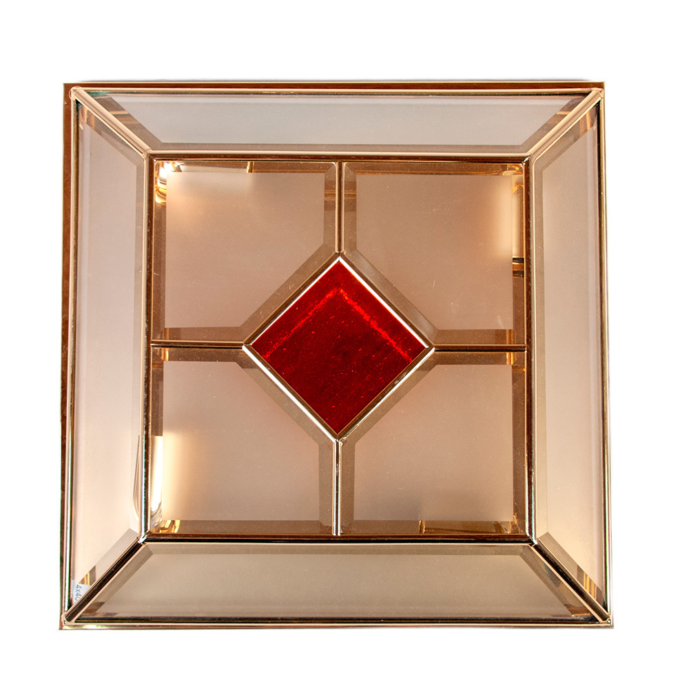 Белые матовые стекла Мурано с изящным фальцетом мягко рассеивают свет, наполняя пространство теплым, уютным свечением. Яркие акценты цветного стекла добавляют динамики, а золотистая латунная окантовка подчеркивает благородство линий.