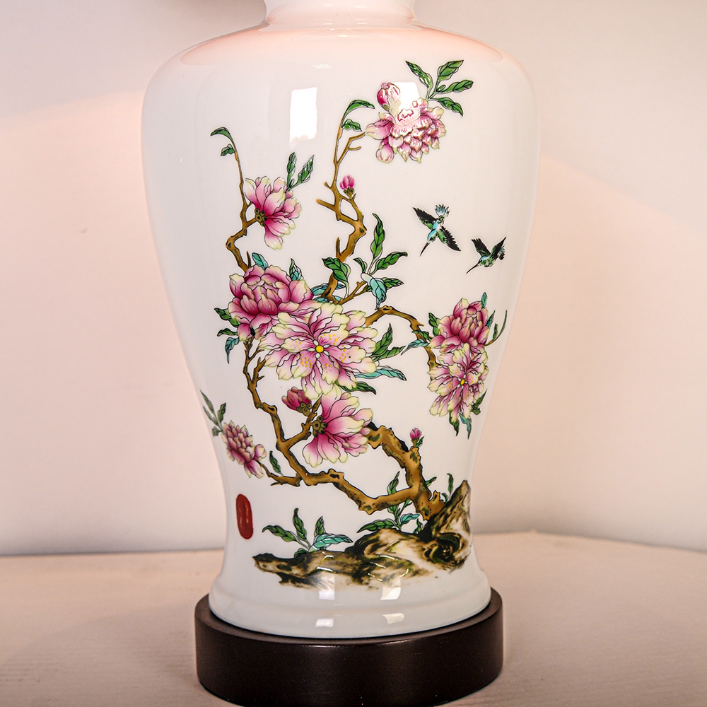 Её белоснежный керамический корпус, выполненный в форме изящной вазы, превращен в художественное полотно. Мастерство восточных художников оживает в нежнейшей росписи: розовые бутоны распускаются в бархатной тишине, а зеленые листья словно шепчутся о весне. Композицию дополняют порхающие птички, привносящие в статичную красоту динамику и легкомысленную грацию.