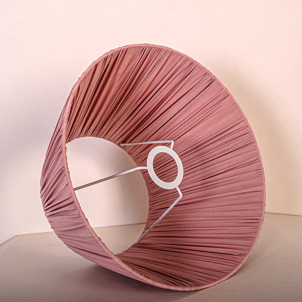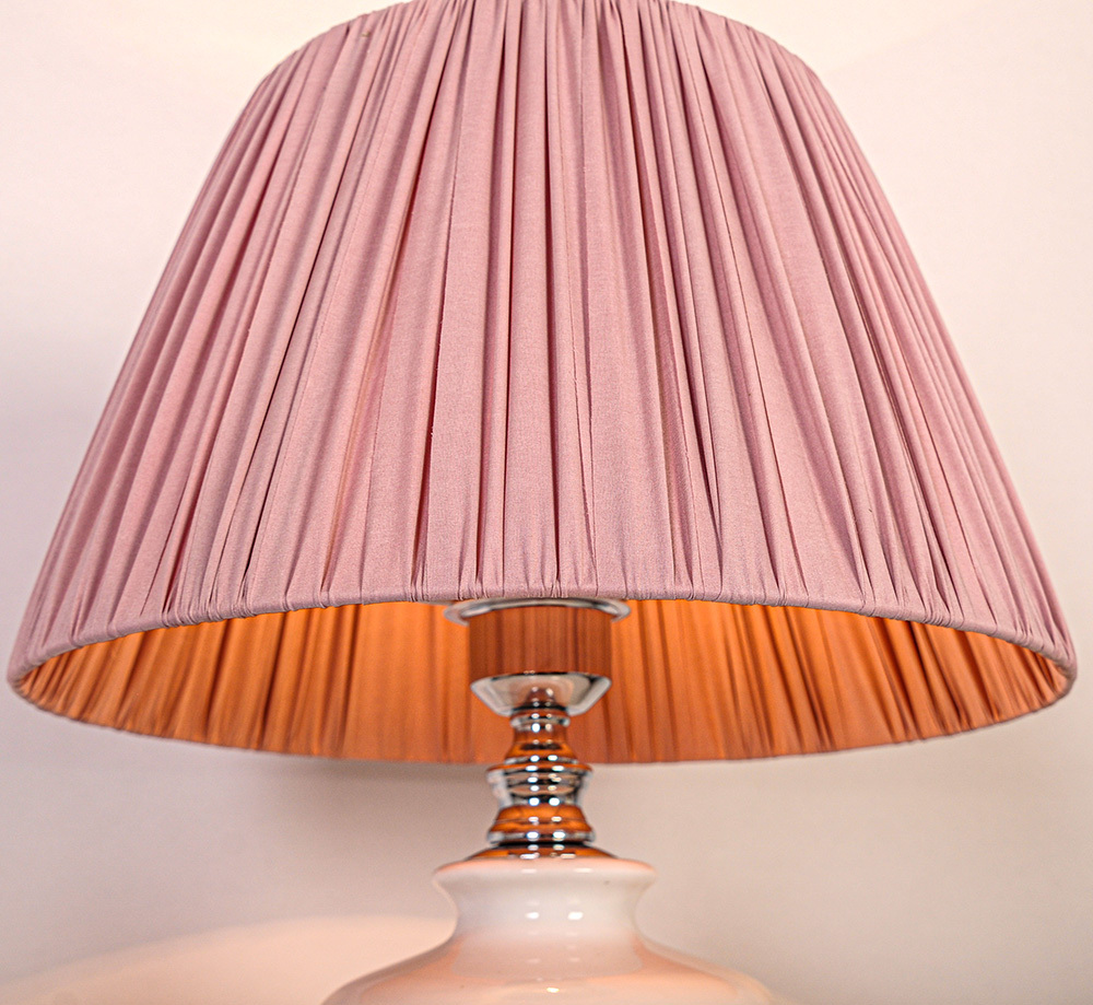 Уютное сияние, окутывающее пространство, обеспечивает абажур из розового текстиля, собранный в элегантные вертикальные складки. Он смягчает свет, создавая в комнате атмосферу тепла и безмятежности.