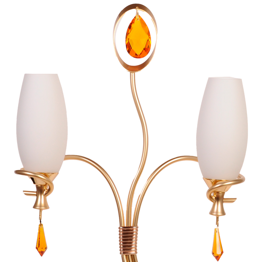 Но настоящая магия скрыта в деталях: в верхней части композиции застыл каплевидный элемент с жёлто-оранжевым кристаллом в центре — он словно маленькое солнце, напоминающее о старинных канделябрах. А под каждым плафоном покачиваются янтарные подвески-капли: при включённом свете они начинают играть бликами, оживляя комнату мягким мерцанием.
