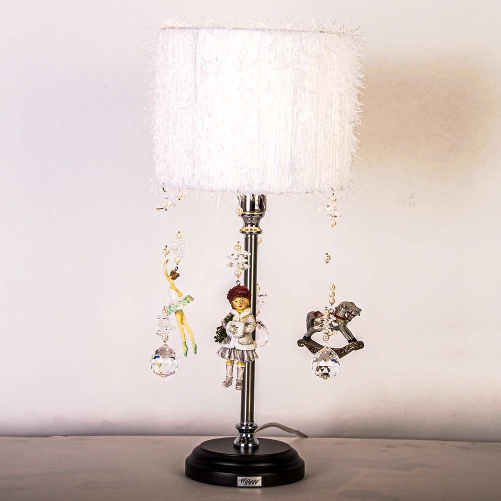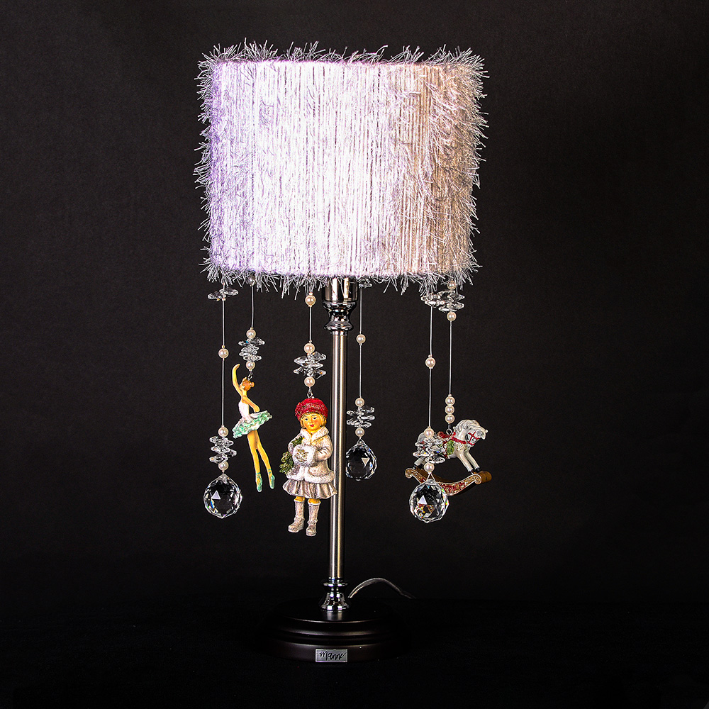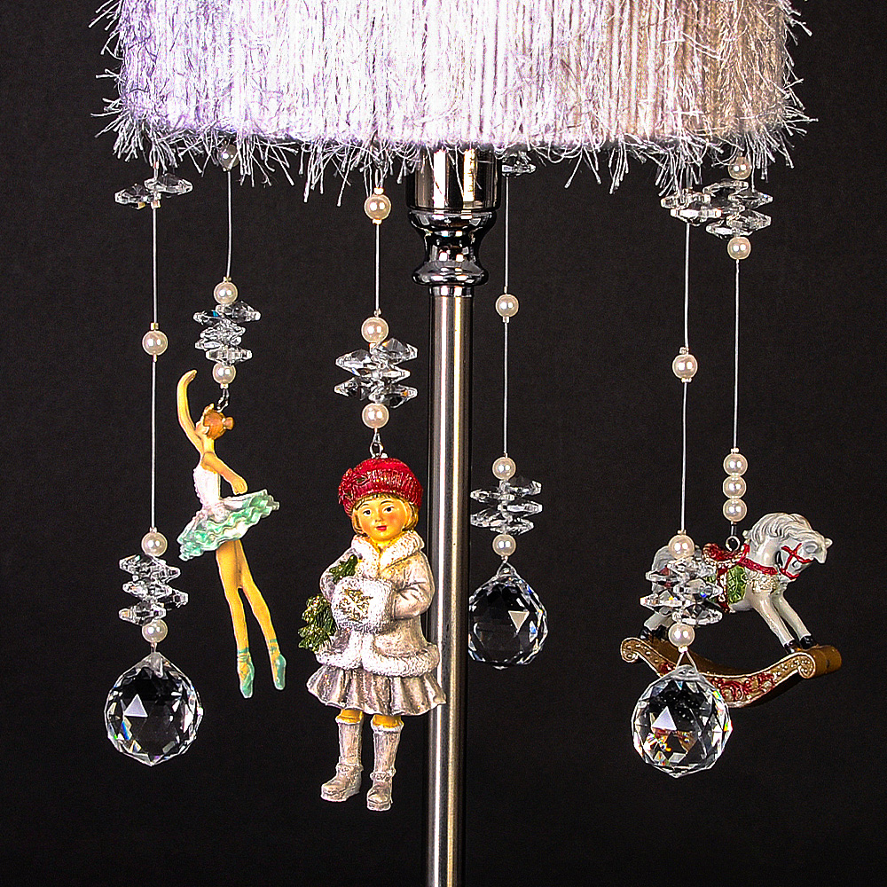 Её абажур, сотканный из белоснежных текстильных лент с серебристой бахромой, напоминает искрящуюся снежную паутинку или невесомое кружево инея. Под легким, воздушным куполом разворачивается целая волшебная история: грациозная балерина в изумрудном платье застыла в изящном па, озорная Красная Шапочка в алом колпачке выглядывает из-под белого пальто, а резвая лошадка-качалка уносит в мир рождественских чудес. Каждая фигурка и дополнительные подвески щедро украшены сверкающими кристаллами, которые, переливаясь в мягком свете, отбрасывают по стенам танец живых бликов.