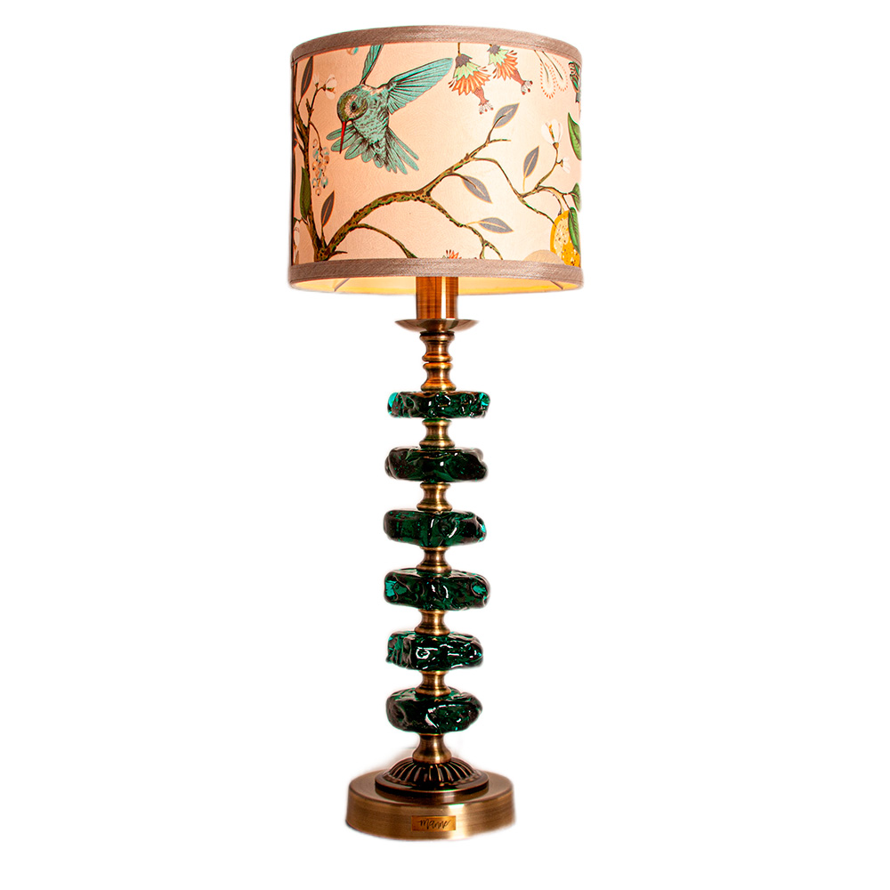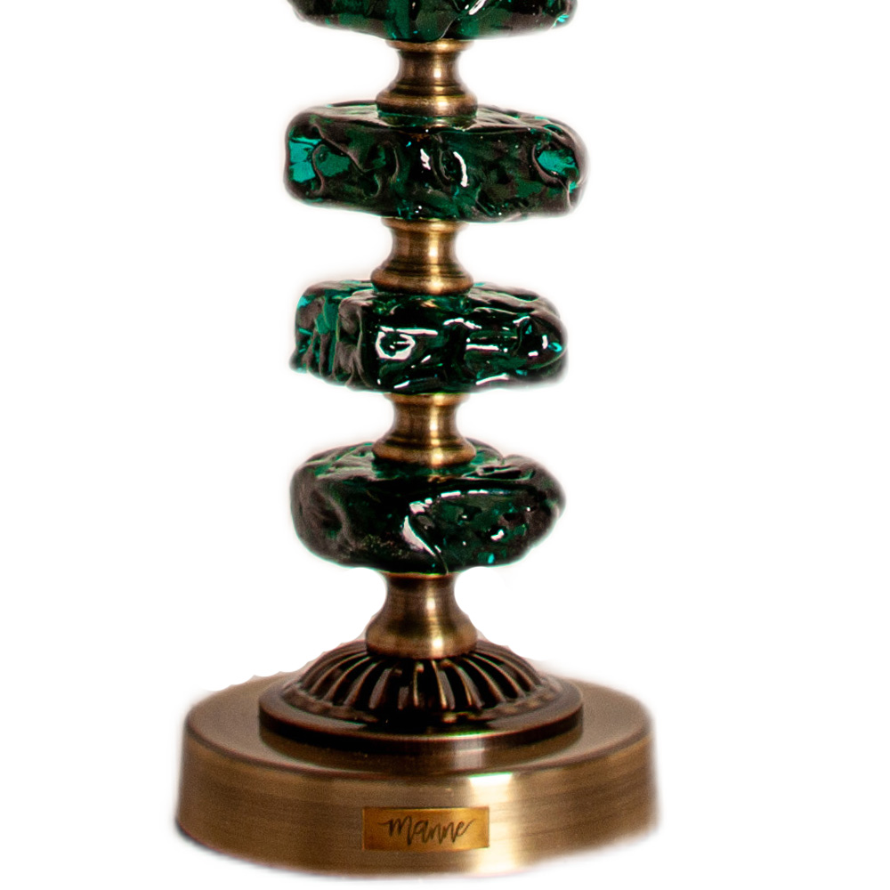 Стебель лампы — настоящая драгоценность: он собран из сияющих глубоко-зелёных стеклянных камней, которые, словно изумруды, переливаются в свете, и тонких металлических колец.