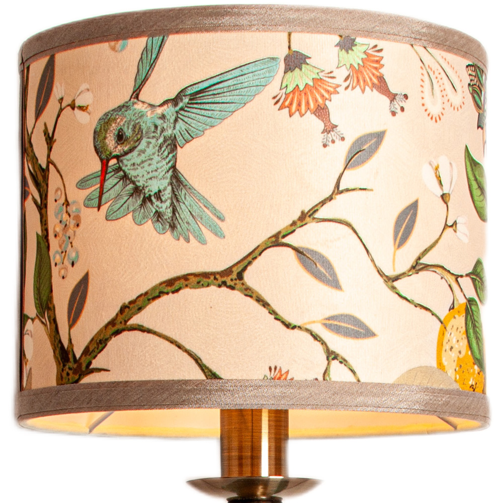 Этот мерцающий столбик венчает нежный тканевый абажур цвета слоновой кости. На нём оживает дивный сад: колибри, замерший у цветущей ветки в окружении листьев, нарисованных мастерской рукой в пастельных тонах. Когда лампа загорается, рисунок становится объёмным, а свет — невероятно мягким и тёплым, создавая оазис спокойствия.