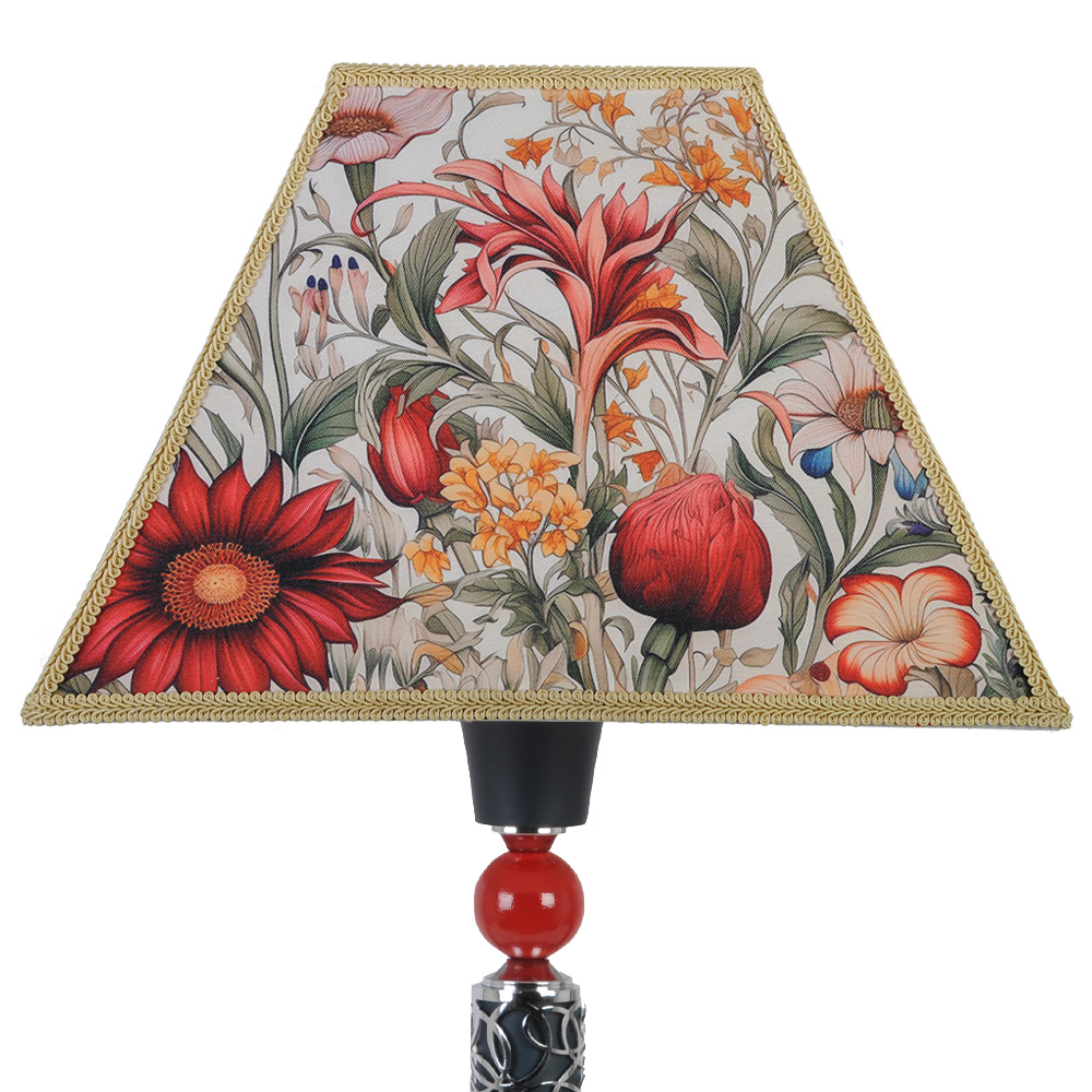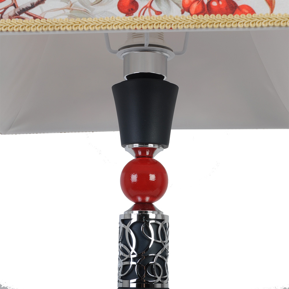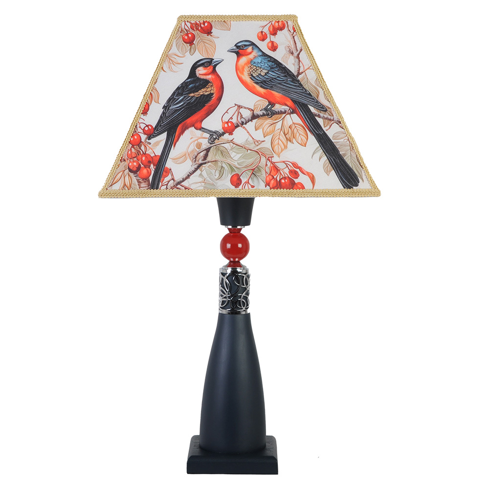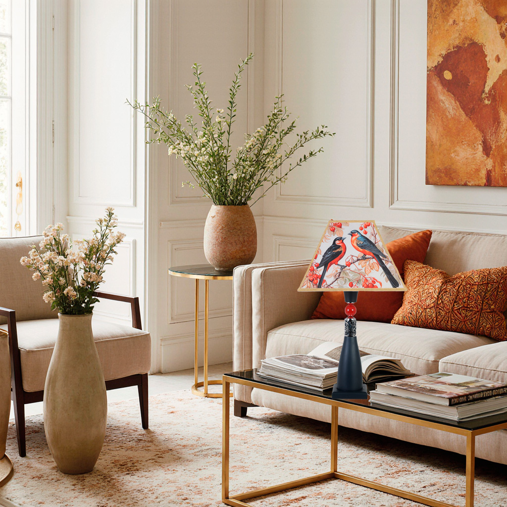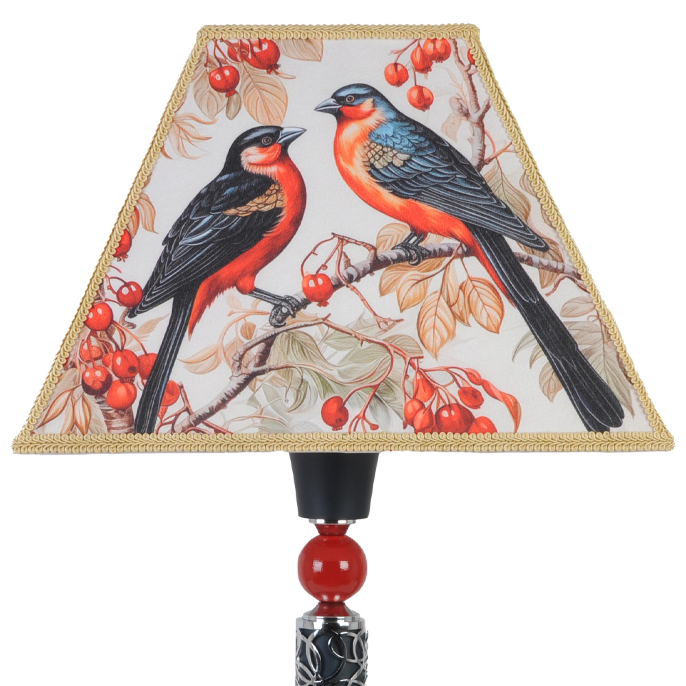 Абажур, выполненный в форме строгой пирамиды с золотистой окантовкой, напоминает шкатулку, в которой скрыта живописная история. Здесь, на пересечении геометрии и искусства, расположилась сцена, полная жизни: две экзотические птицы замерли на ветке рябины. Мастер кропотливо выписал каждое перо, позволив красному, синему и черному цветам переливаться в зависимости от освещения, создавая объем. Гроздья алых ягод контрастируют с бежевой нежностью листьев, наполняя помещение энергией природы и сказочным сюжетом.