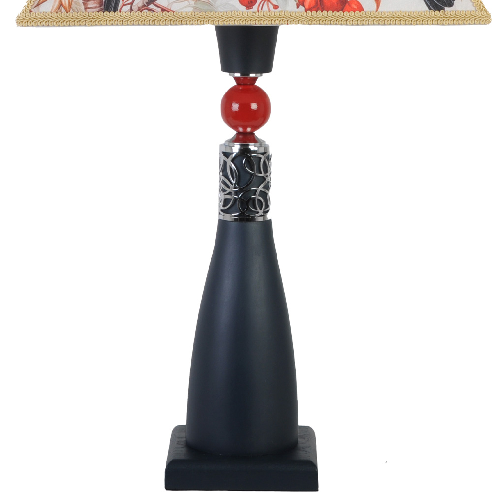 В её основе лежит выразительный конус темно-синего цвета — цвет ночного неба и глубокой тишины. Это массивное основание словно удерживает свет, не давая ему уйти, а изящный хромированный орнамент, опоясывающий его, играет бликами, добавляя скульптурности и той самой изысканности, которая отличает истинные арт-объекты от серийных изделий. Завершает композицию основания яркая рубиновая бусина — драгоценная капля, служащая элегантным переходом к главному сокровищу лампы.