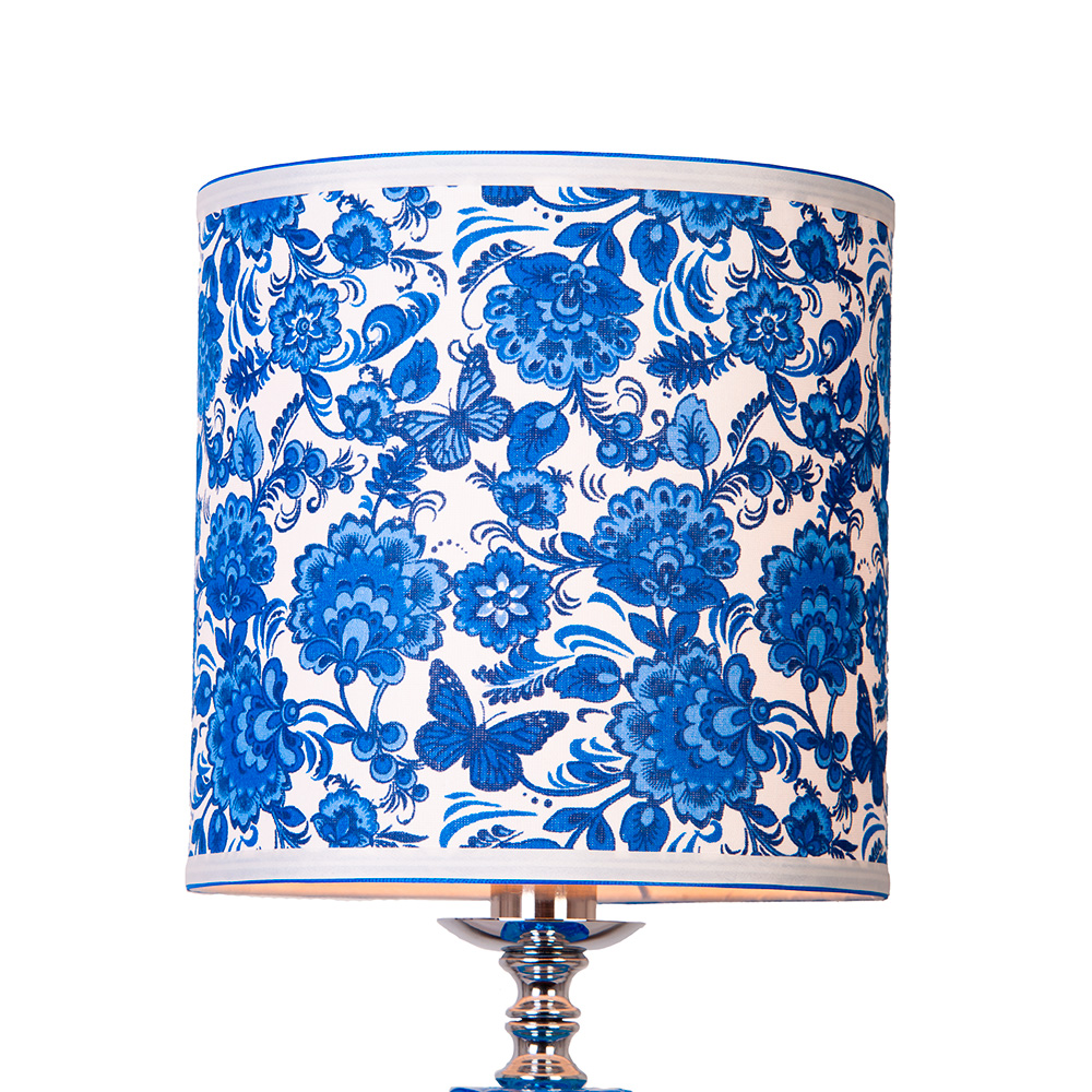 Особого внимания заслуживает изысканный цилиндрический текстильный абажур с нежным узором Gzhel. Высотой 22 см и диаметром 20 см, он гармонично дополняет конструкцию и мягко рассеивает свет, создавая приятную атмосферу, идеально подходящую как для работы, так и для отдыха. Лампа эффективно освещает пространство площадью до 4 м² и станет идеальным спутником в уютных вечерних или рабочих моментах.