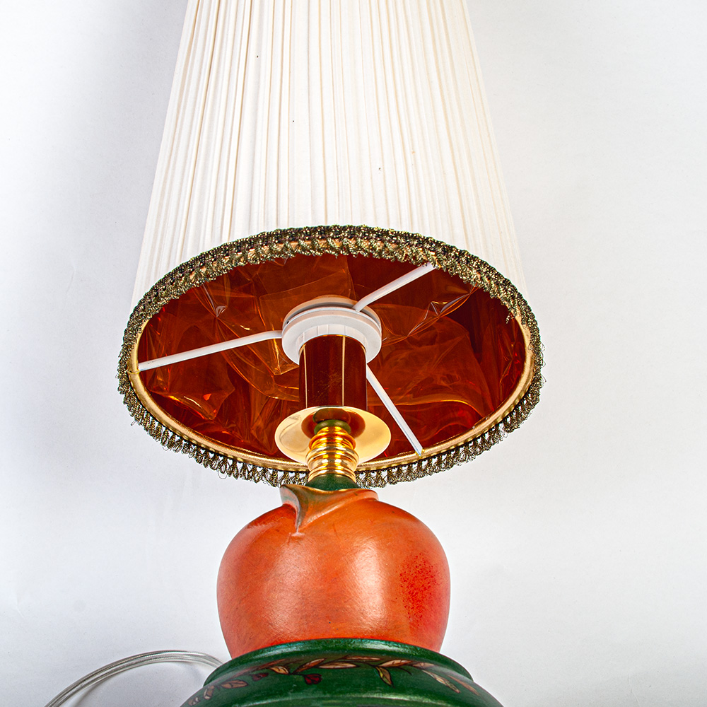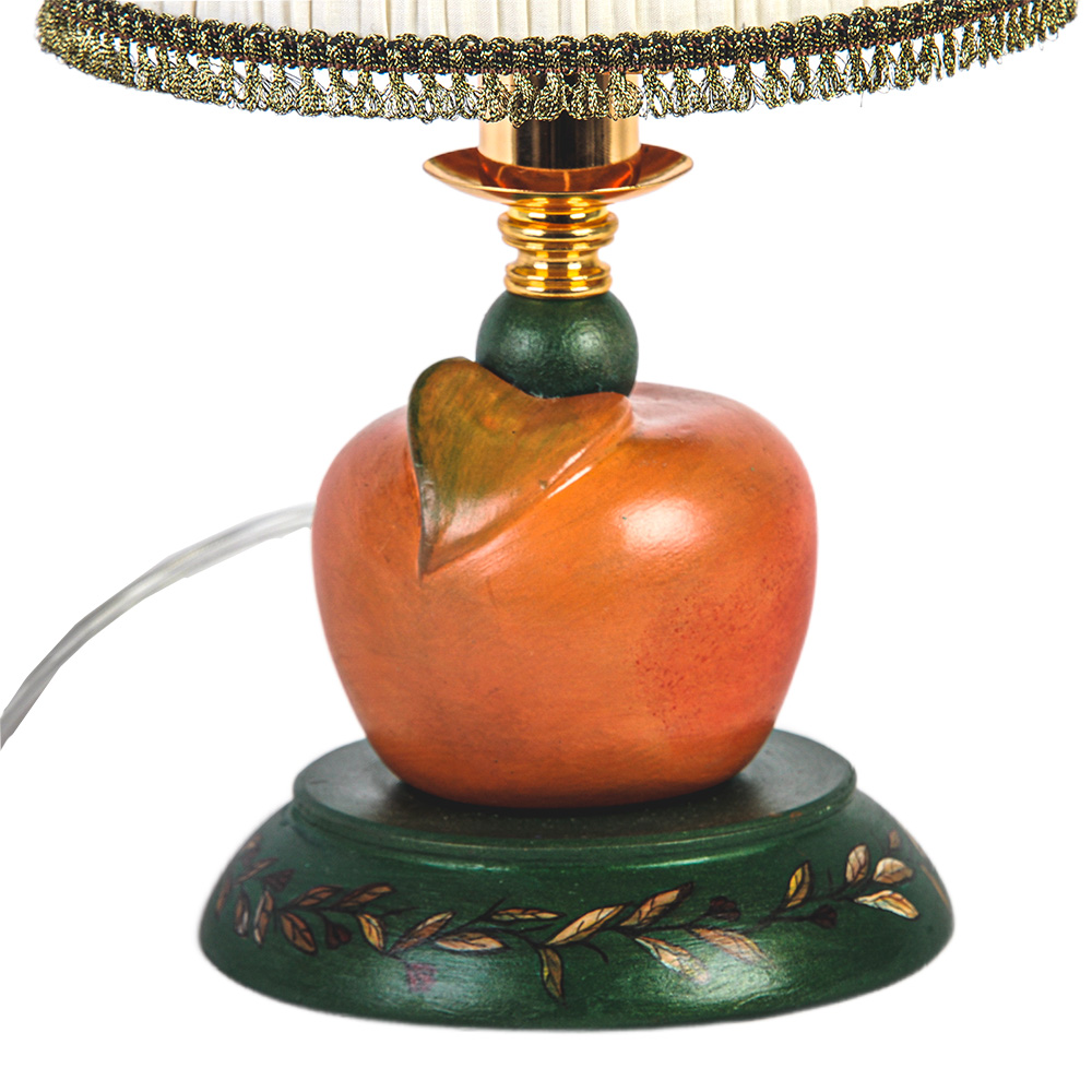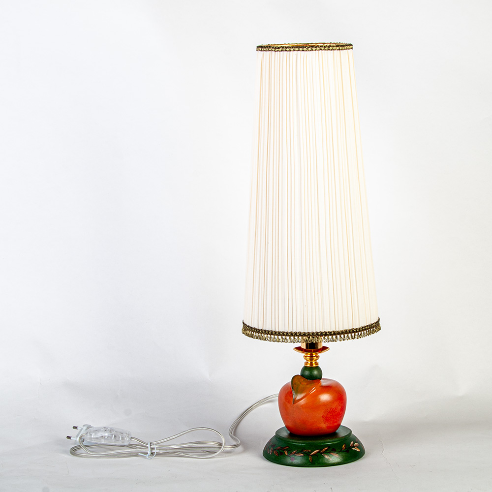 В ее сердце — изысканное керамическое яблоко, созданное вручную из красной глины. Оно излучает теплый, бархатный блеск, притягивая взгляд и даря ощущение гармонии с природой. Это та самая вечная ценность, которая передается из поколения в поколение. Внизу — деревянное основание с изящной росписью в виде зеленых листьев, будто только что сорванных с ветки, добавляя композиции свежести и завершенности.