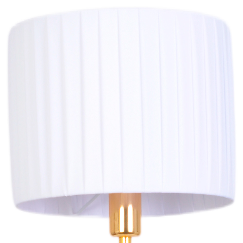 Этот хрупкий шедевр увенчан белоснежным текстильным абажуром в вертикальную полоску, который мягко и бережно рассеивает свет, превращая его в тёплое, уютное сияние площадью до 3 м². Каждая деталь, от широкого устойчивого основания до филигранного стеклянного узора, говорит о высочайшем качестве российской сборки и материалов.