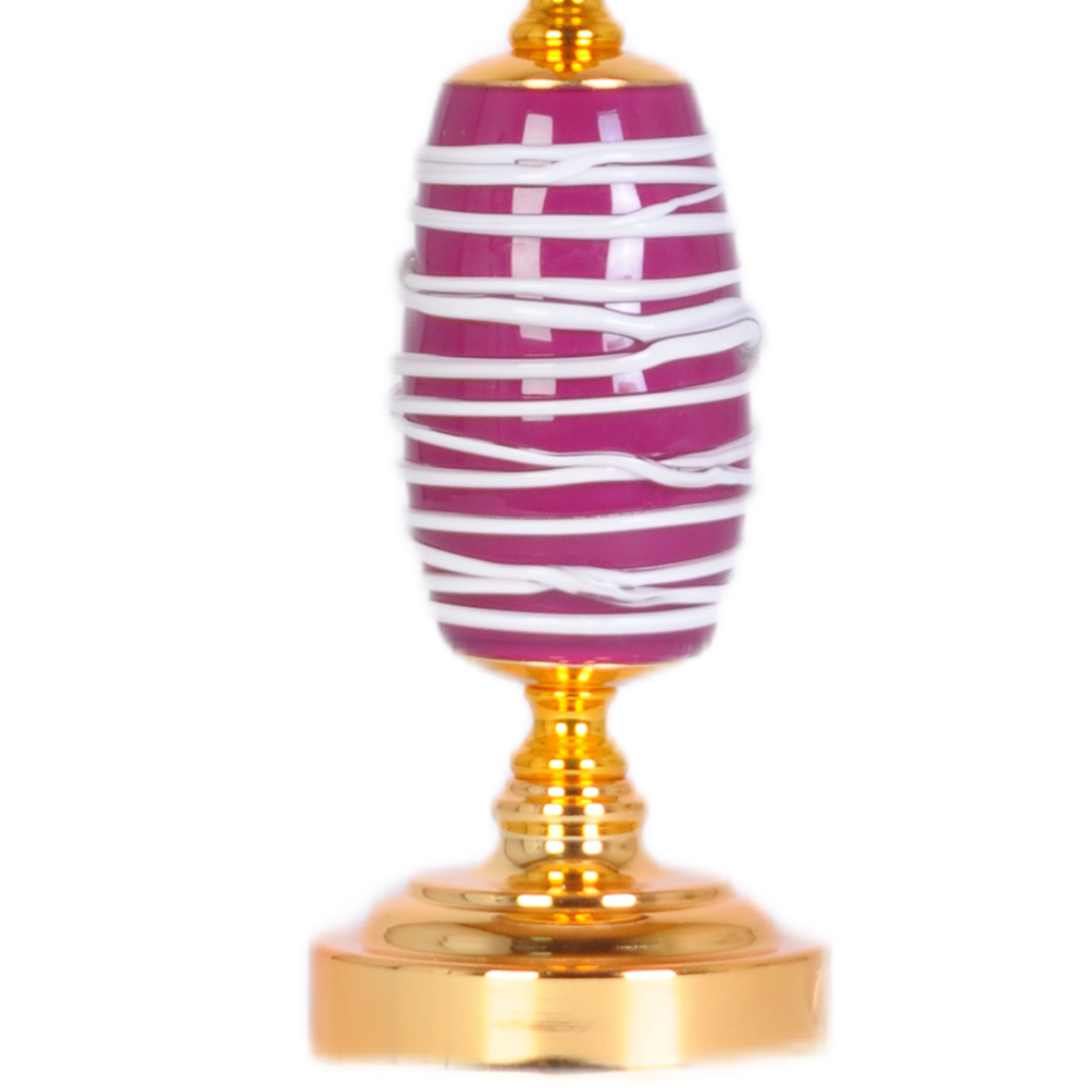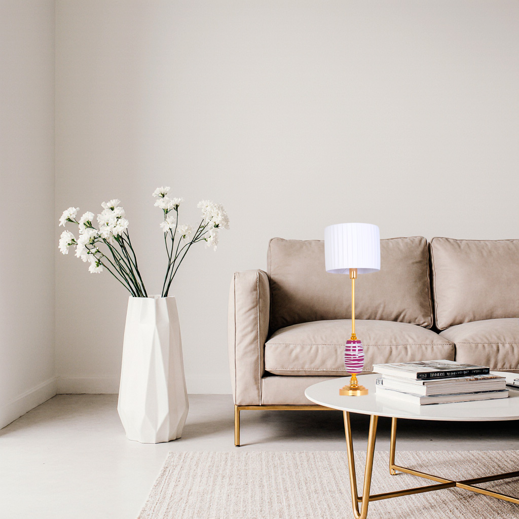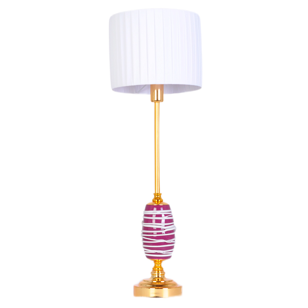 Настольная лампа Manne TL.7818-1GO RED — это диалог эпох, где вечная классика говорит на языке современного дизайна. Её сердце — золотистый металлический корпус, а душа — в уникальном декоре. Взгляните на ножку: вокруг стержня обвит цилиндр из стекла насыщенного фиолетового оттенка, играющего градиентом от густого аметиста до нежной лаванды. По его поверхности струятся белые полосы, подобные застывшим в танце волнам, создавая игру света и тени даже в выключенном состоянии.