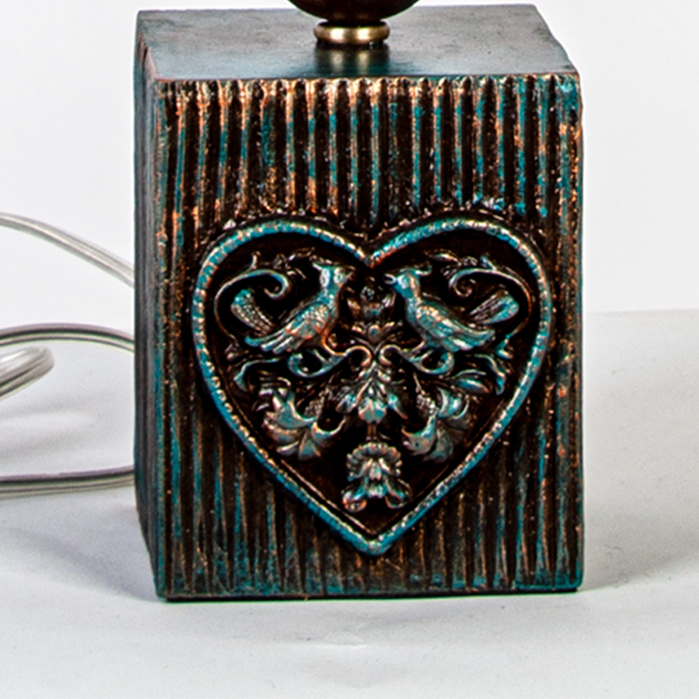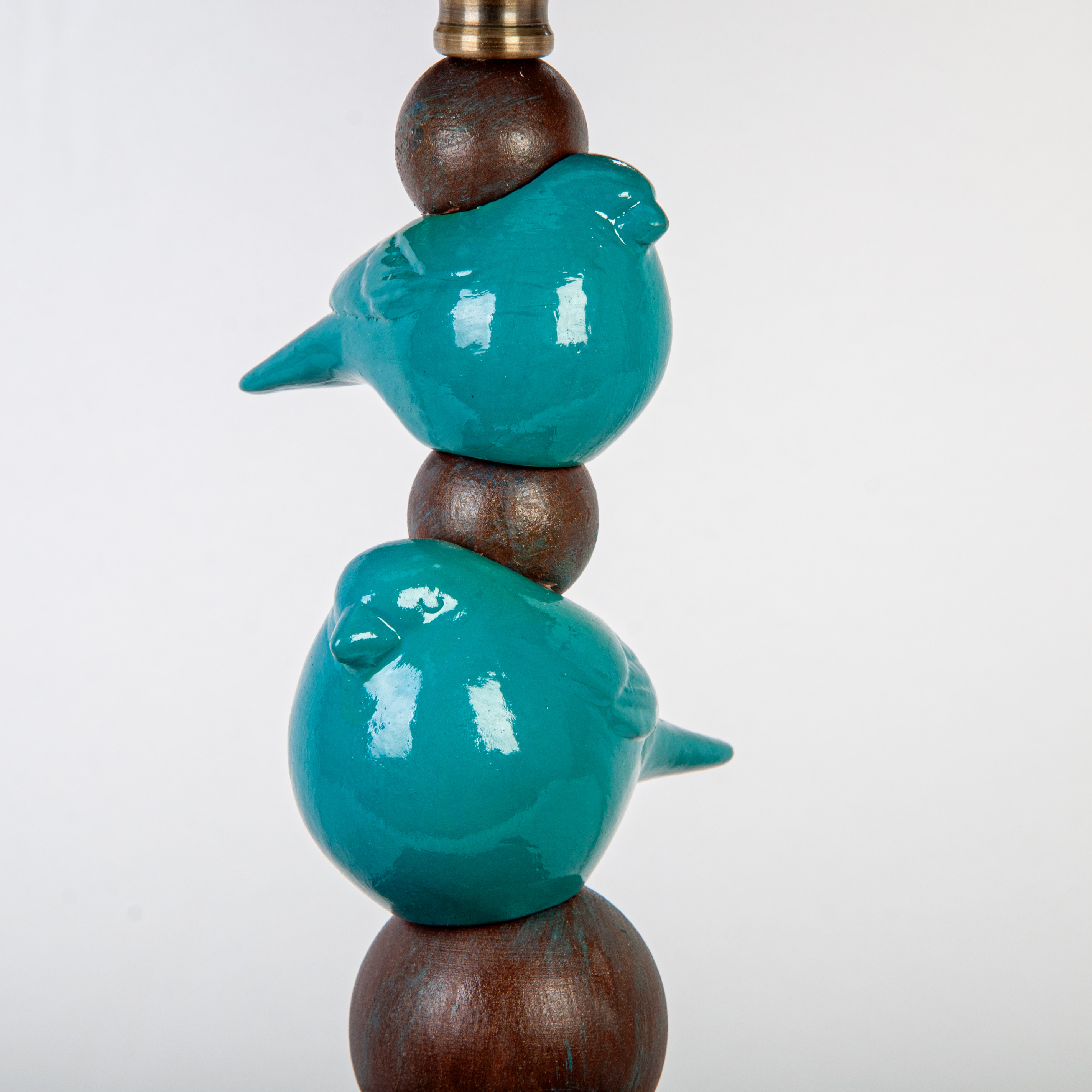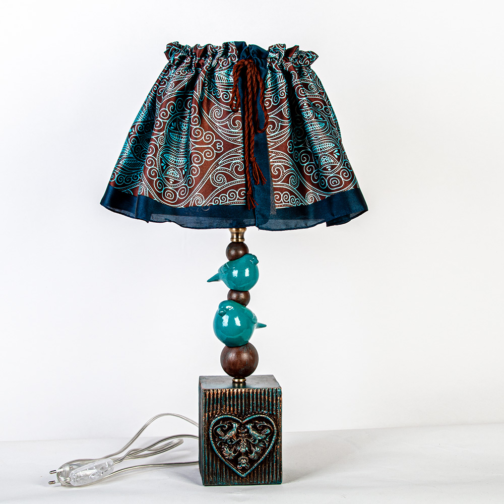 Ее основой служит массивная деревянная подставка коричневого цвета, на которой красуется сердце — символ тепла и уюта, украшенный затейливыми русскими орнаментами. От этого сердца тянется ввысь изящный стебель, где коричневые шары словно бусины дорогого чокера сменяются парой голубых керамических птиц. Эти птицы — не просто декор, это хранители вашего очага, приносящие в дом радость и динамику.