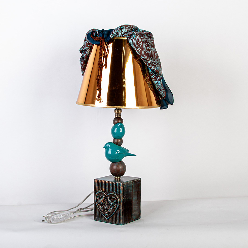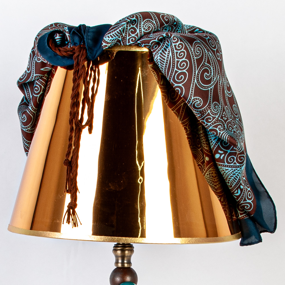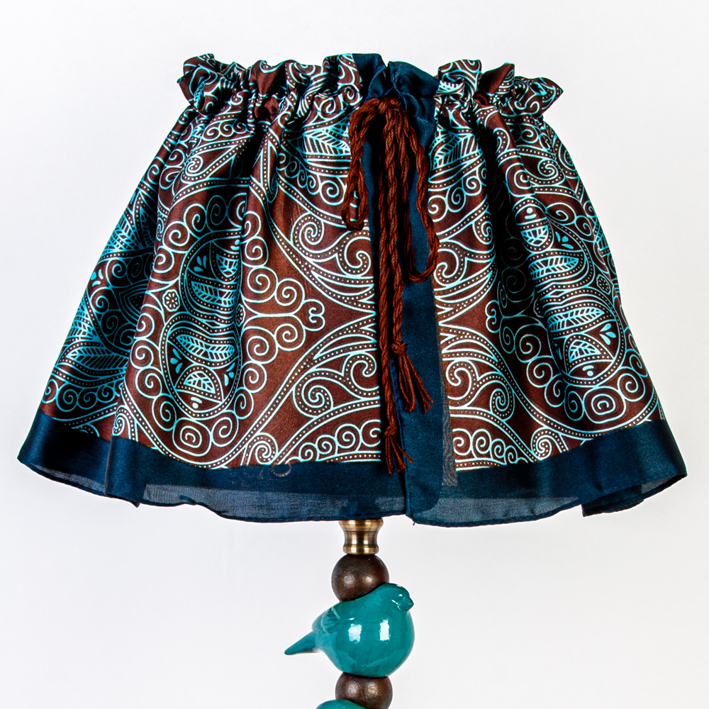 Но главная магия раскрывается с наступлением сумерек. Внутри скрывается технологичное сердце — двухсторонний пластиковый абажур-трансформер. Серебристый изнутри, он мощно и мягко рассеивает свет, создавая комфортное для глаз освещение на площади до 3 м². А его золотистая внешняя сторона придает свечению необыкновенно теплый оттенок. На этот функциональный элемент надето праздничное «платье» — внешний текстильный абажур с роскошным голубым узором на коричневом фоне. Его форма с оборками и декоративной лентой добавляет композиции легкости и воздушности. И это та самая возможность для персонализации: вы всегда можете снять внешний абажур, чтобы получить более сдержанный свет, или надеть его, чтобы преобразить пространство.