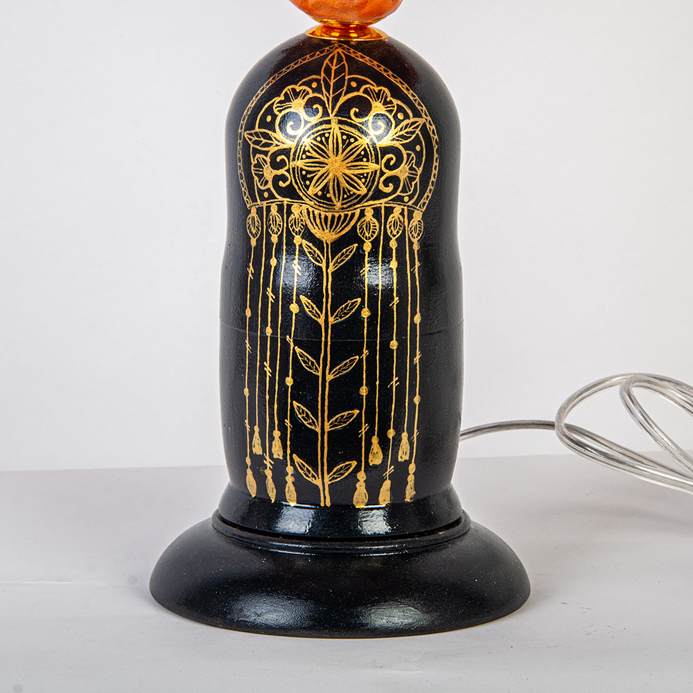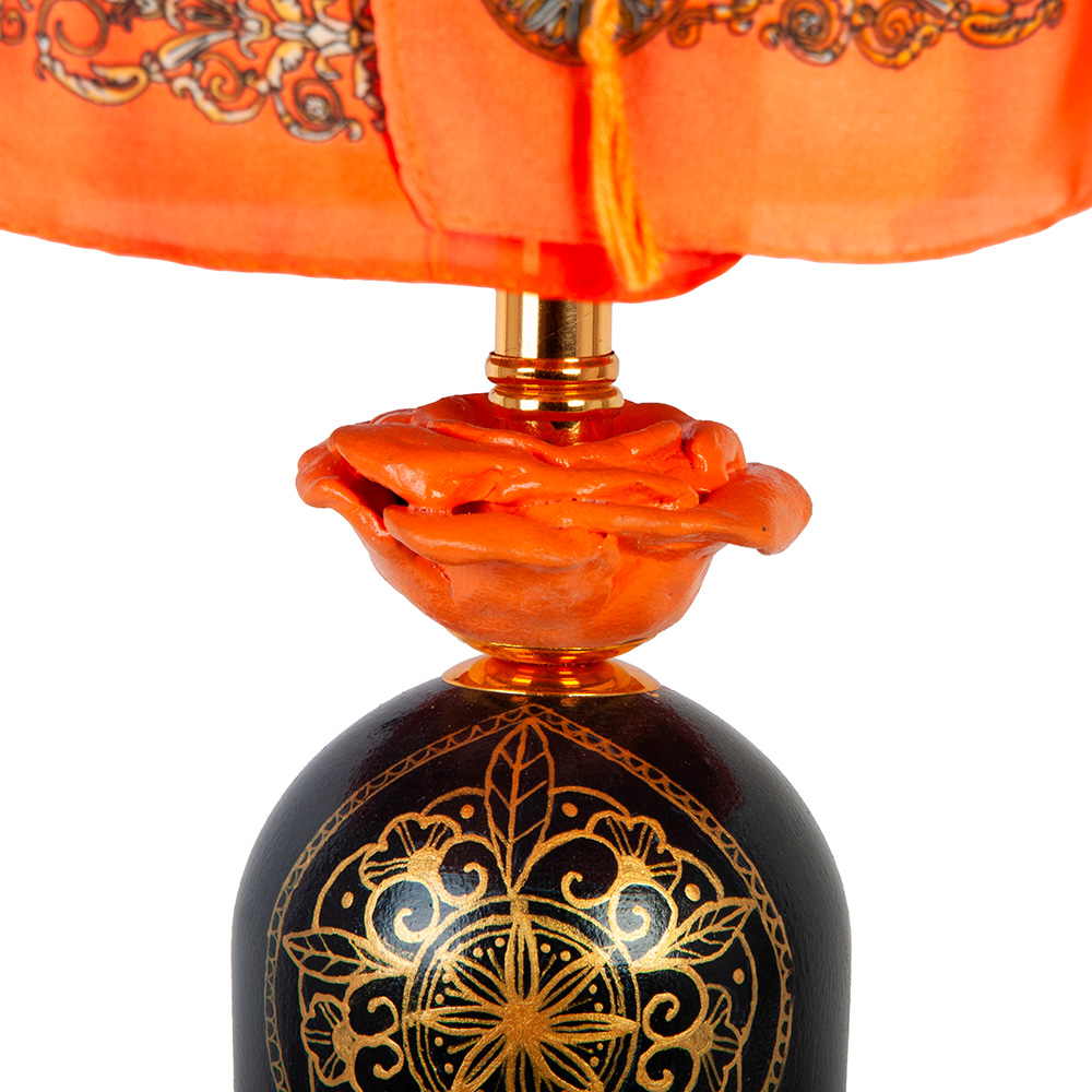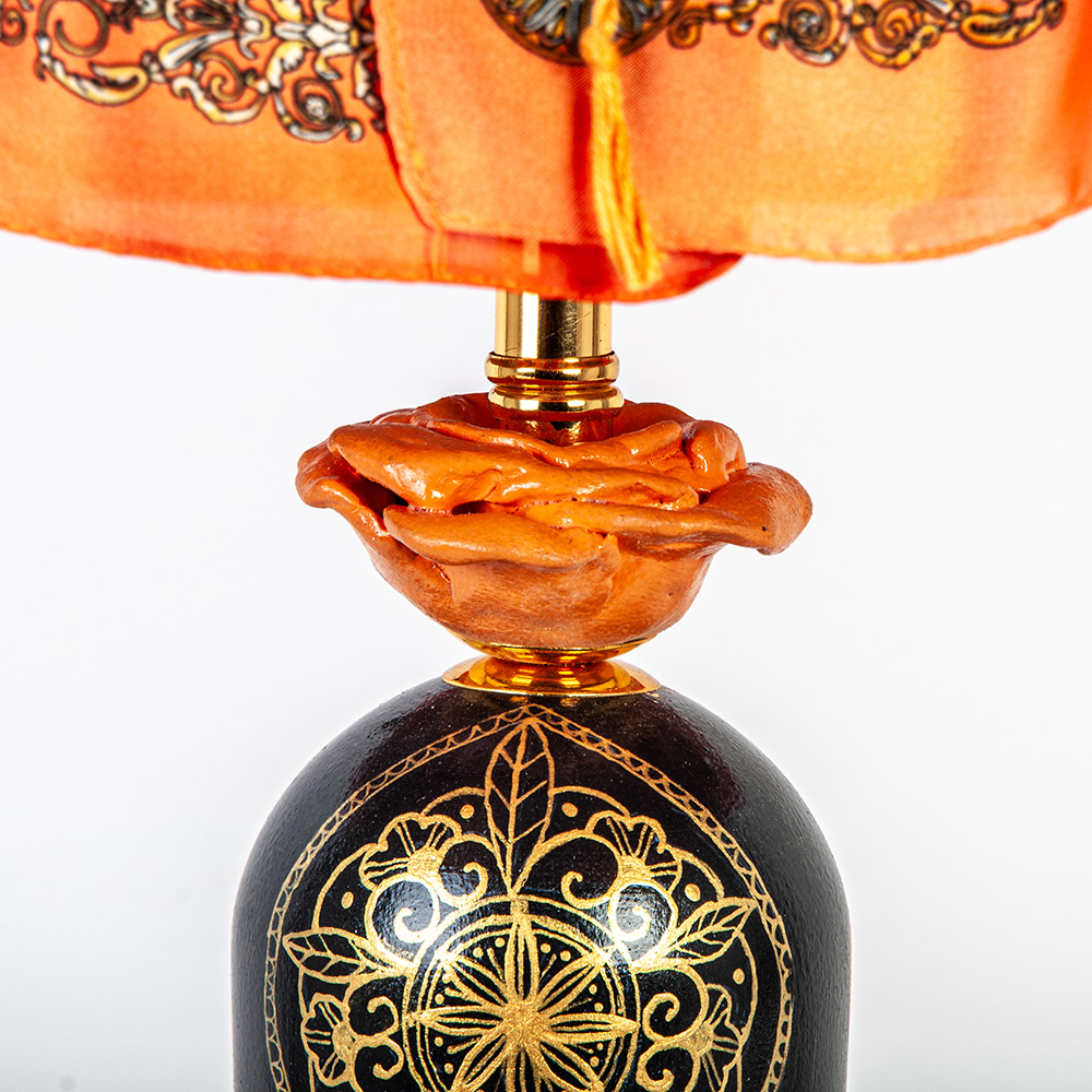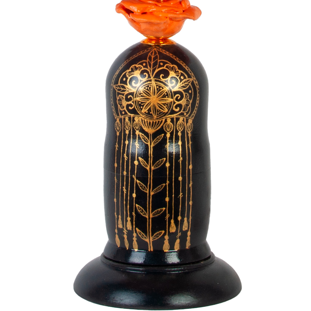 Её основание, выточенное из натурального дерева в форме старинной бутыли, — это холст для мастеров. На черном фоне - тончайшая золотая роспись создаёт сказочные узоры, каждый из которых выполнен вручную. Трогательная деталь — алая роза на горлышке.