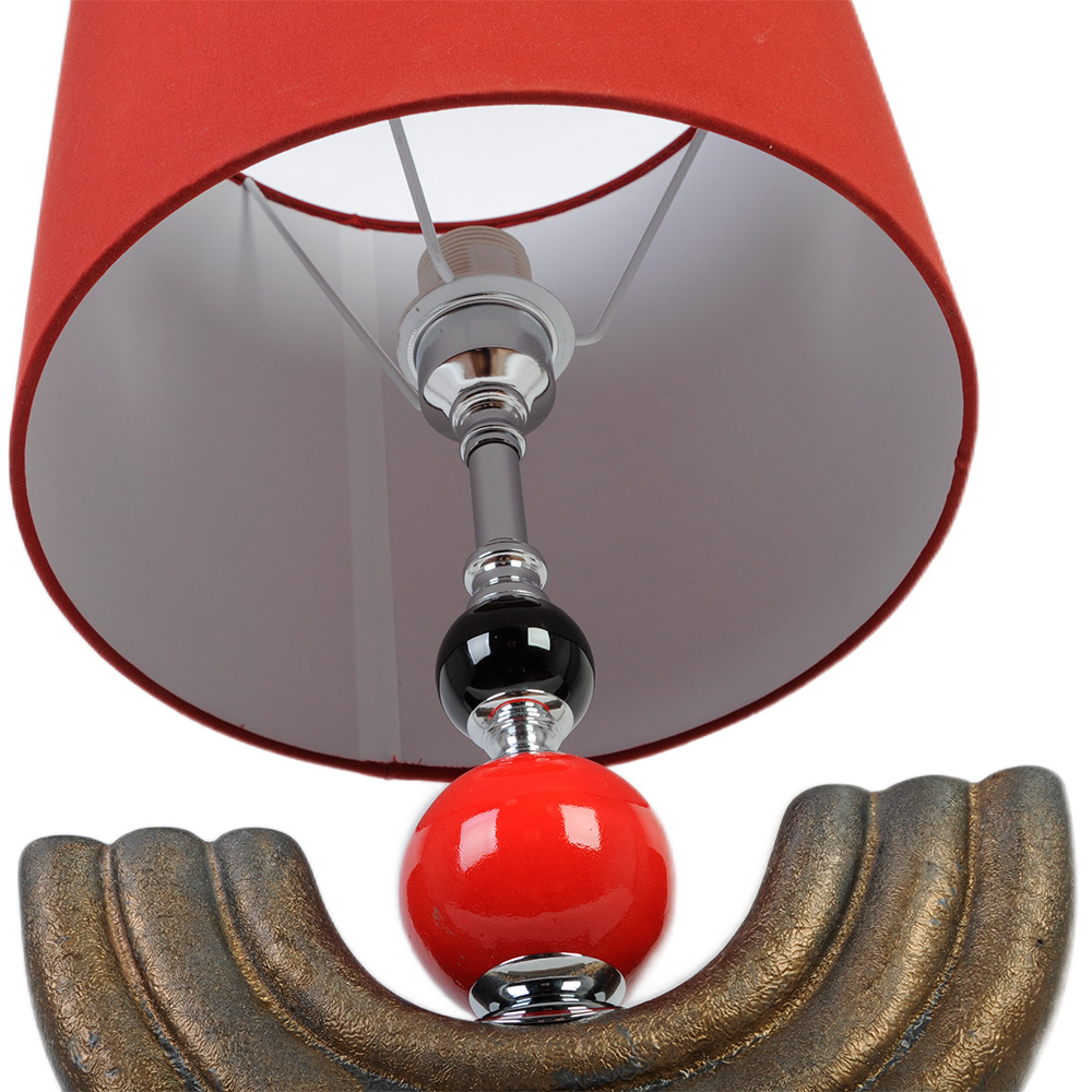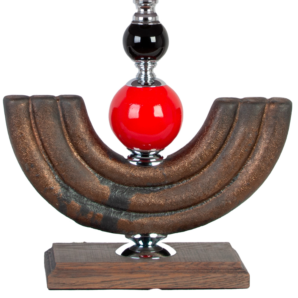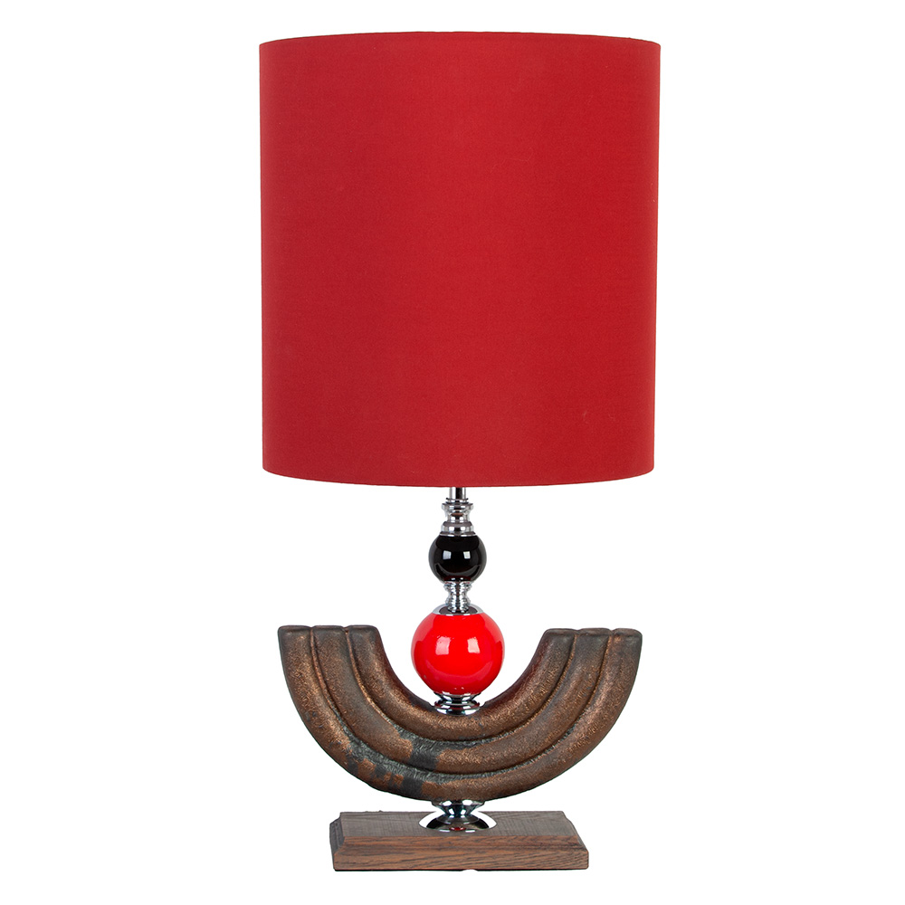 Её цилиндрический абажур, выполненный в насыщенном красном цвете, — это не просто деталь, это акцентная точка, способная преобразить пространство. Стройная стойка, словно застывшее в керамике танго, изгибается в плавной линии, сияя благородным коричневым оттенком с металлическим блеском. Её украшают декоративные сферы-бусины в тон абажура, добавляя игривости и глубины образу.