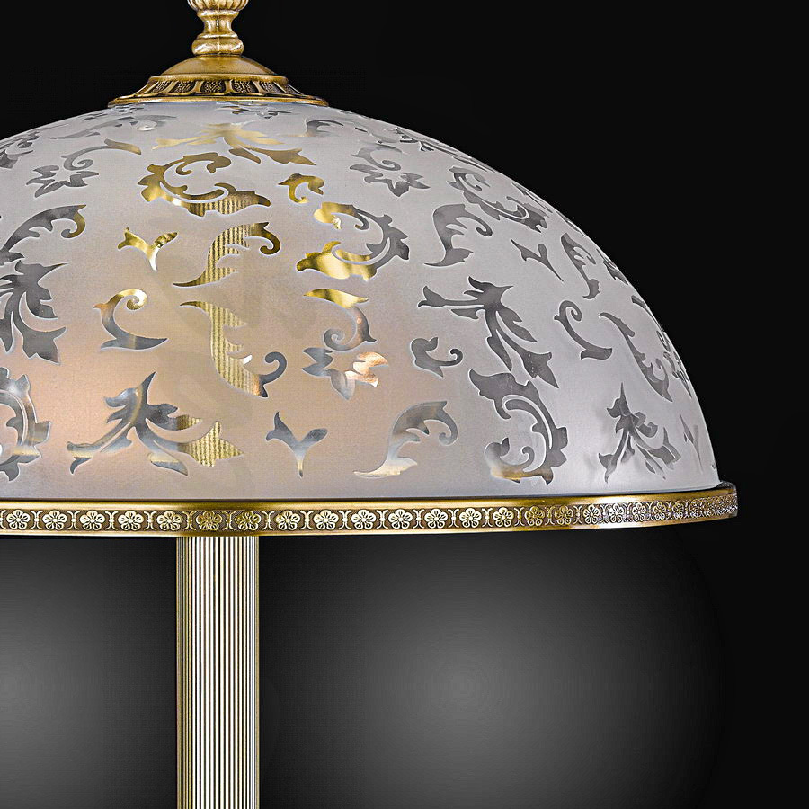 Ее стройная вертикальная стойка, увенчанная плафоном из полупрозрачного молочного стекла, напоминает изящный цветок, готовый озарить ваш вечер мягким, теплым сиянием. Плафон украшен тончайшим декоративным узором, который нежно рассеивает свет, превращая его в живую игру теней и создавая неповторимую атмосферу уюта и респектабельного спокойствия.