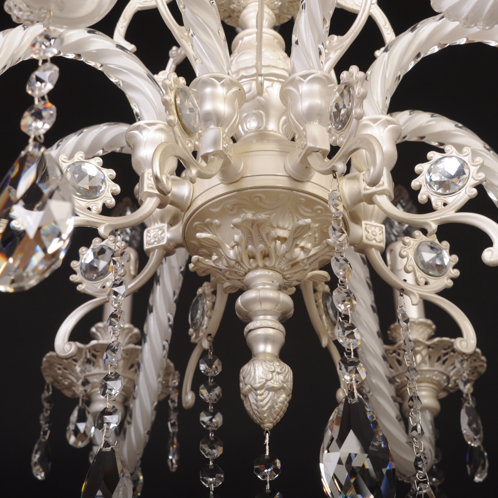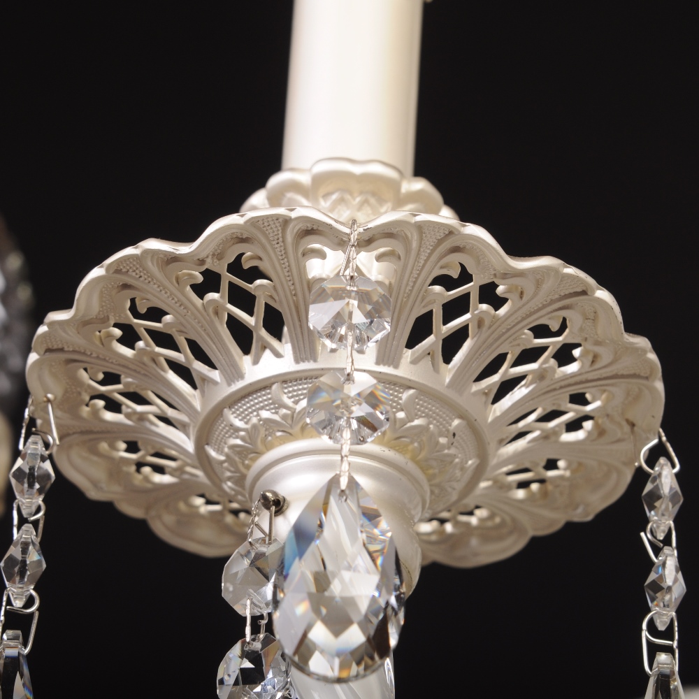 Но главное волшебство начинается, когда свет проходит сквозь прозрачные хрустальные подвески. Здесь есть всё: каплевидные кристаллы, цилиндрические огранённые призмы и круглые линзы — каждая форма играет по-своему, дробя луч на радужные блики. Восемь ламп, стилизованных под пламя свечей, мягко мерцают на золотых держателях, создавая романтическую, почти театральную атмосферу. Люстра щедро освещает до 24 м² — идеально для просторной гостиной, парадного зала ресторана или бальной комнаты. Здесь свет не просто рассеивается — он танцует, переливается, преображает каждый уголок, даря ощущение вечного праздника.