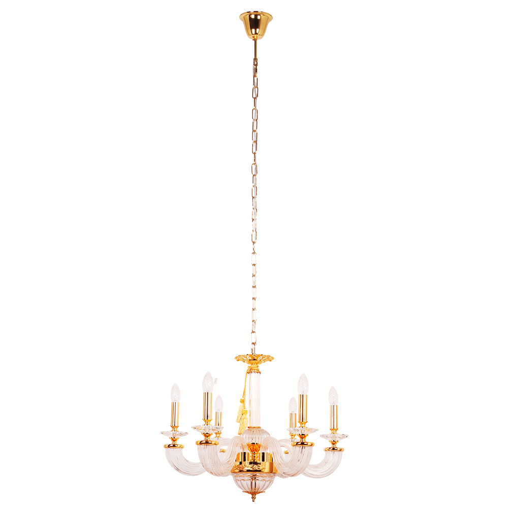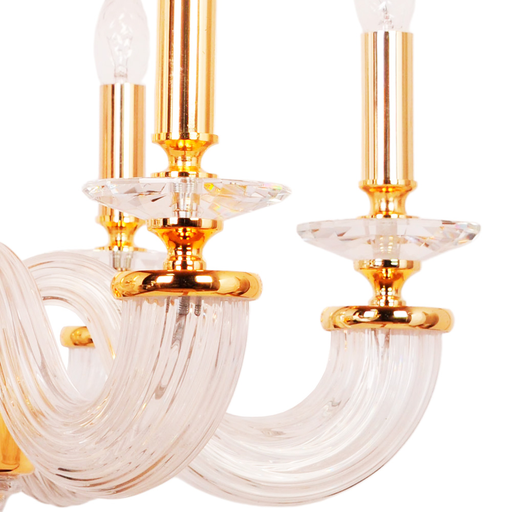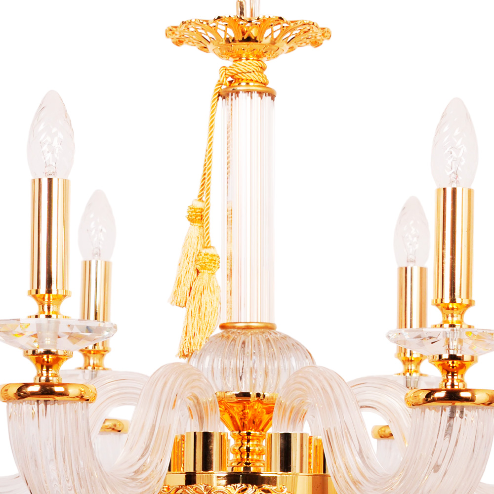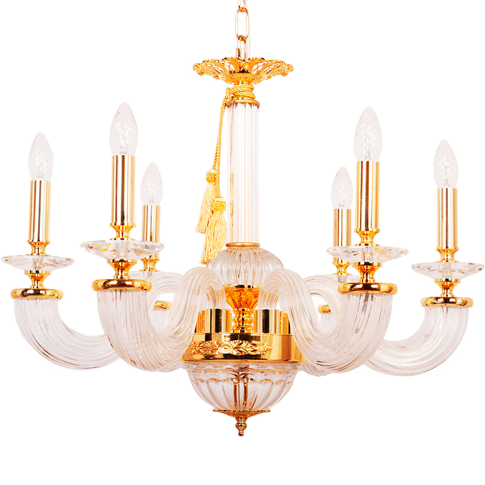 Но настоящее волшебство скрыто в шести изогнутых стеклянных рожках, расходящихся подобно ветвям драгоценного дерева. На каждом рожке закреплён изящный держатель — патрон для лампы-свечи, а низ каждого патрона украшен прозрачной стеклянной чашей, похожей на крошечный хрустальный цветок. Когда вы включаете свет, лампы-свечи загораются мягким, живым огнём — он не слепит, а ласкает взгляд, создавая ощущение романтичного ужина в старинной усадьбе. Стеклянные чаши у основания патронов ловят каждый лучик и рассыпают его сотнями нежных бликов, а в центре композиции, как драгоценная капля, застыла массивная стеклянная чаша с золотыми вкраплениями.