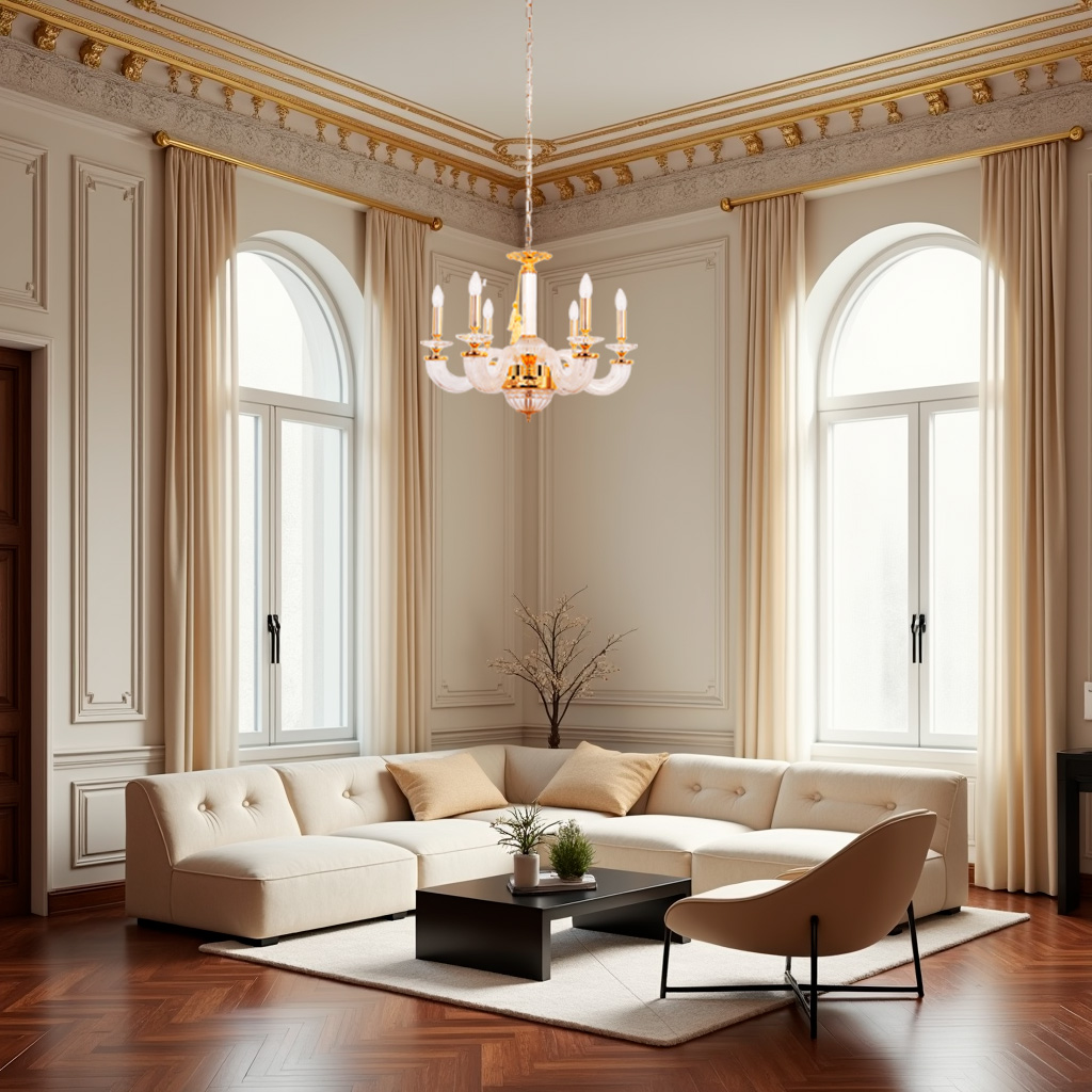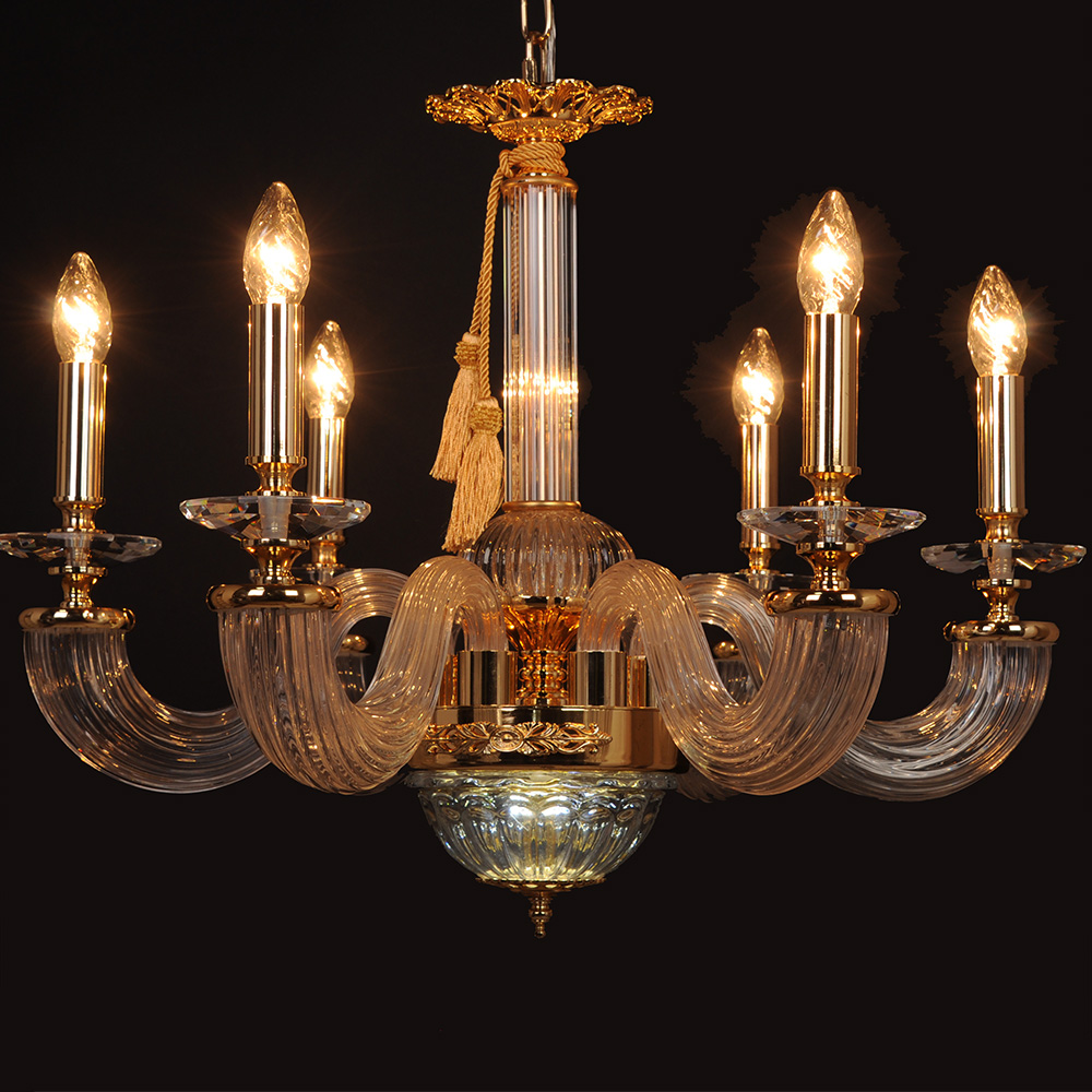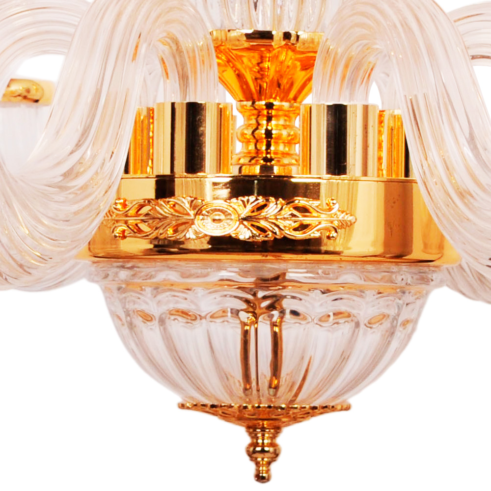 Но настоящее волшебство скрыто в шести изогнутых стеклянных рожках, расходящихся подобно ветвям драгоценного дерева. На каждом рожке закреплён изящный держатель — патрон для лампы-свечи, а низ каждого патрона украшен прозрачной стеклянной чашей, похожей на крошечный хрустальный цветок. Когда вы включаете свет, лампы-свечи загораются мягким, живым огнём — он не слепит, а ласкает взгляд, создавая ощущение романтичного ужина в старинной усадьбе. Стеклянные чаши у основания патронов ловят каждый лучик и рассыпают его сотнями нежных бликов, а в центре композиции, как драгоценная капля, застыла массивная стеклянная чаша с золотыми вкраплениями.