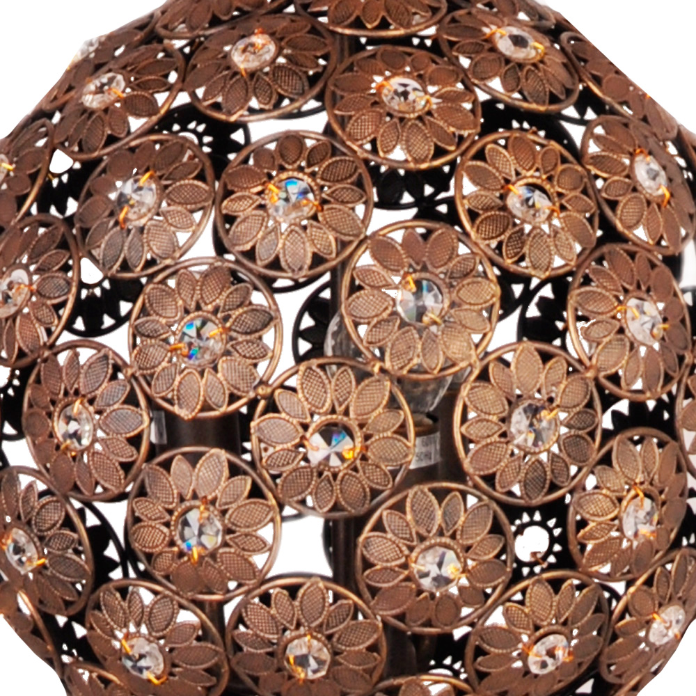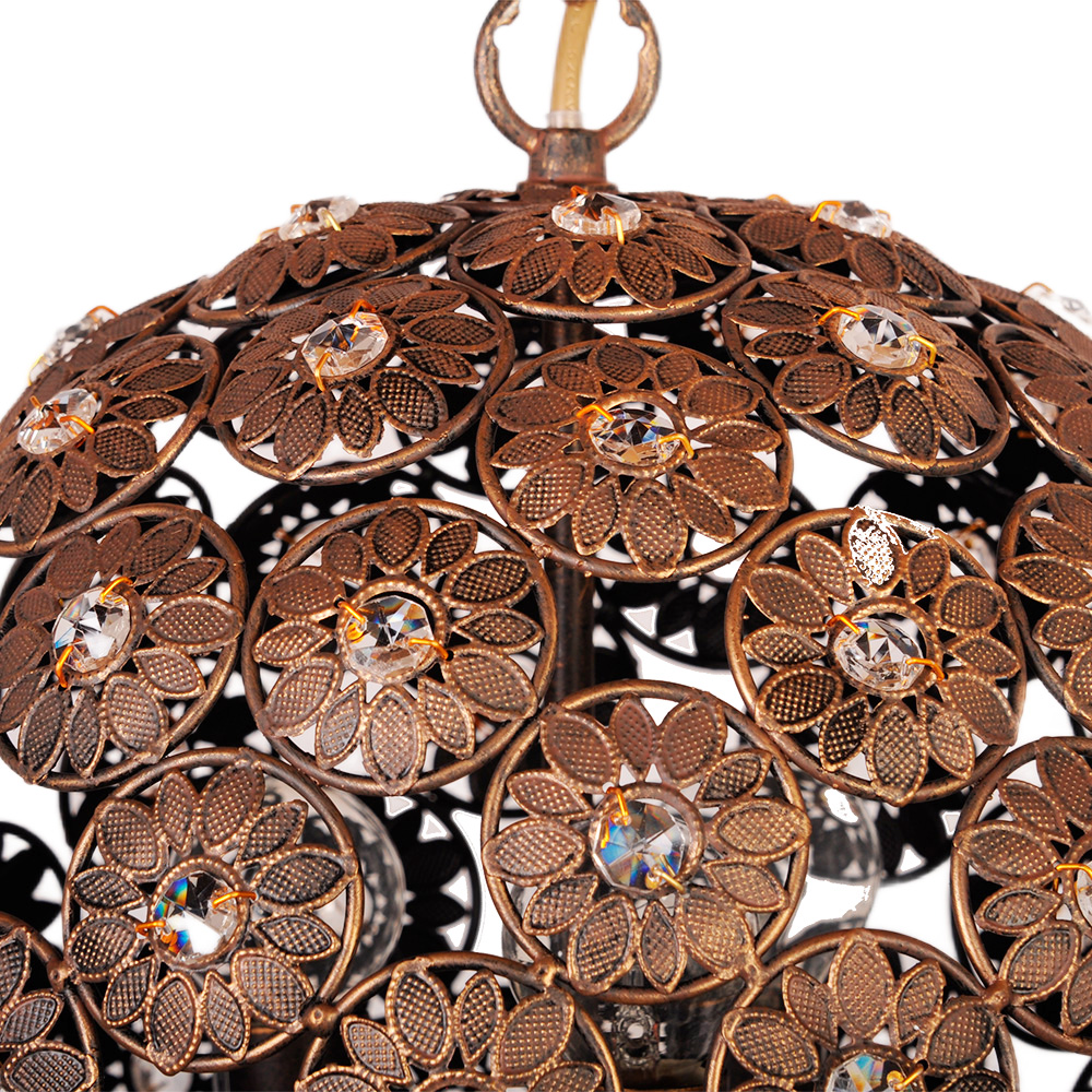 Её большой круглый плафон, отлитый из прочного металла в благородном цвете старой бронзы, напоминает изысканное кружево, сплетённое из света и металла. Взгляд сразу притягивает ажурный узор: каждый элемент этой конструкции — это круглый медальон, где по окружности, словно тонкое тиснение, вьются искусно выполненные листья, а в самом сердце сияет огранённый хрустальный кристалл, собирающий и преломляющий каждый лучик.