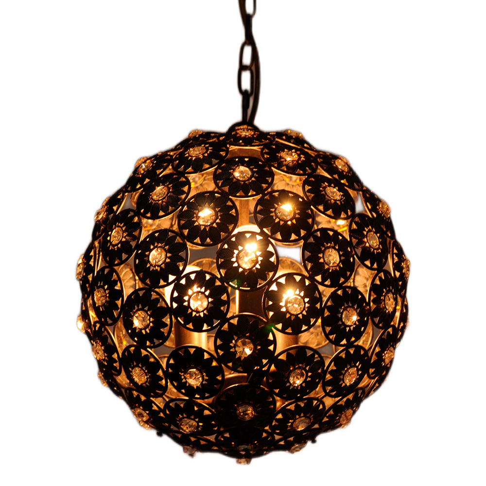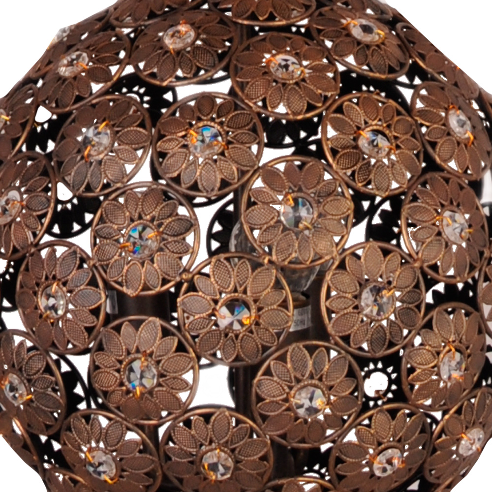 Её большой круглый плафон, отлитый из прочного металла в благородном цвете старой бронзы, напоминает изысканное кружево, сплетённое из света и металла. Взгляд сразу притягивает ажурный узор: каждый элемент этой конструкции — это круглый медальон, где по окружности, словно тонкое тиснение, вьются искусно выполненные листья, а в самом сердце сияет огранённый хрустальный кристалл, собирающий и преломляющий каждый лучик.