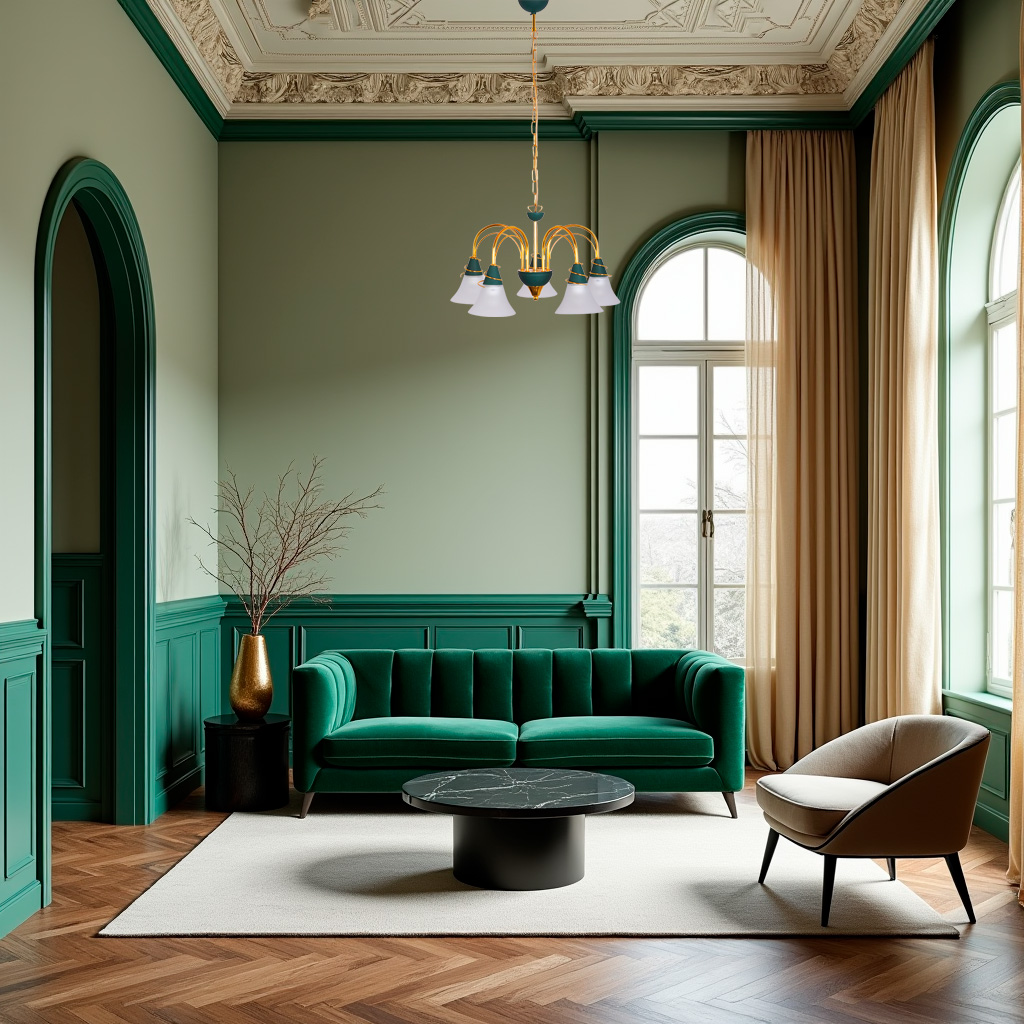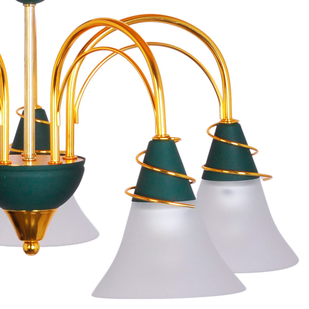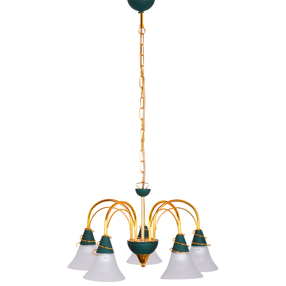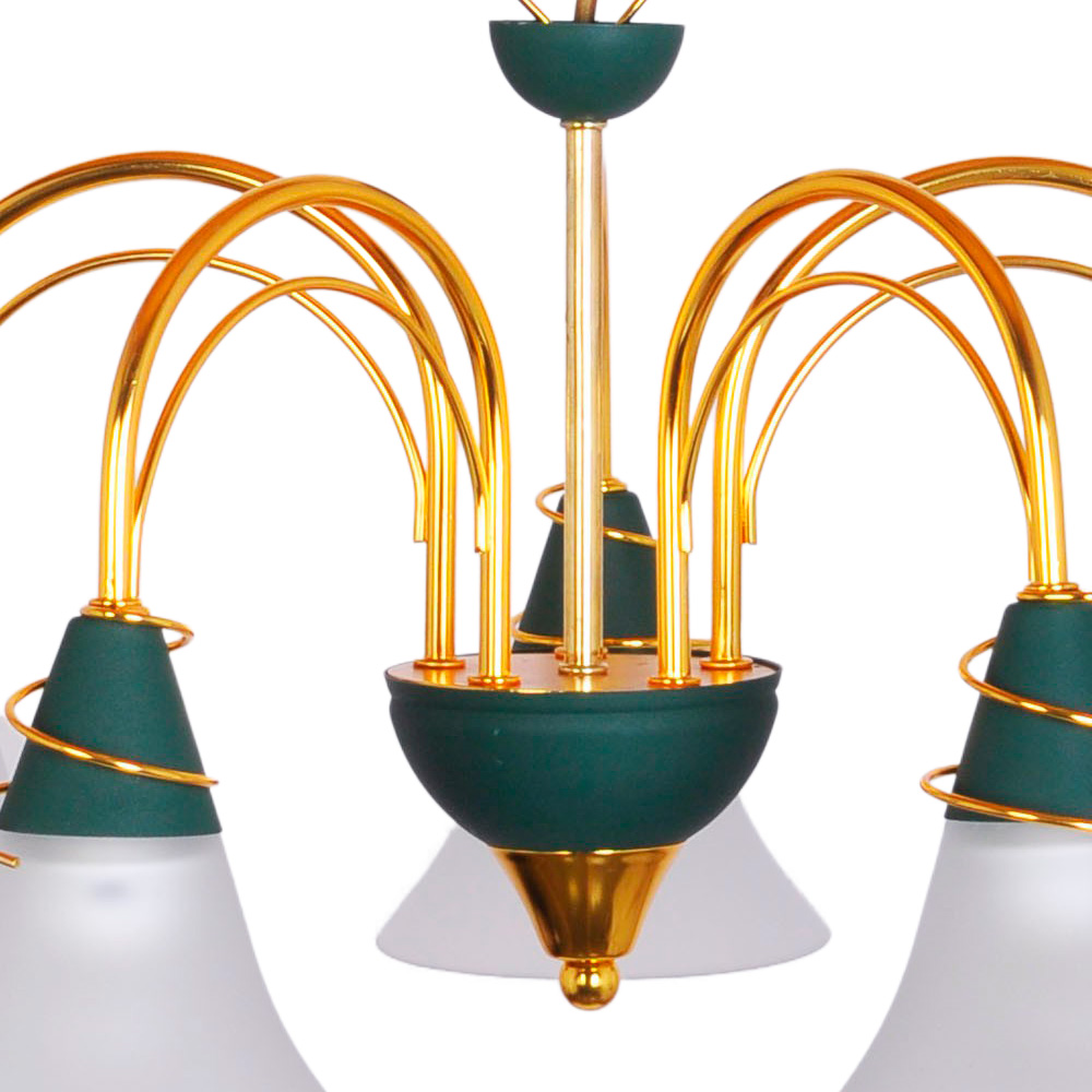 Пять плафонов из матового стекла молочного оттенка напоминают нежные колокольчики, застывшие в танце. Они смотрят вниз, чтобы дарить мягкий, рассеянный свет — идеальный для уютных вечеров в гостиной, долгих застолий в столовой или расслабляющих минут перед сном в спальне. Но главное очарование скрывается в деталях. Каждый плафон крепится к стержню изящной золотой дугой, которая изгибается вверх, словно стебель экзотического цветка. А на макушке каждого «колокольчика» — тёмно-зелёный акцент, драгоценный изумрудный блик. Этот контраст молочно-белого, золотого и глубокого зелёного создаёт эффект старинной шкатулки с секретом: чем дольше смотришь, тем больше находишь новых оттенков.