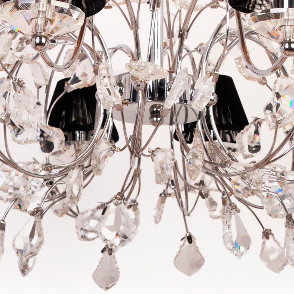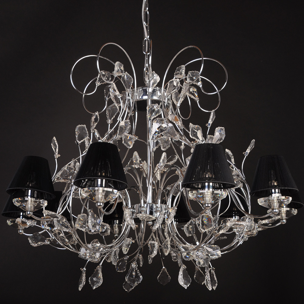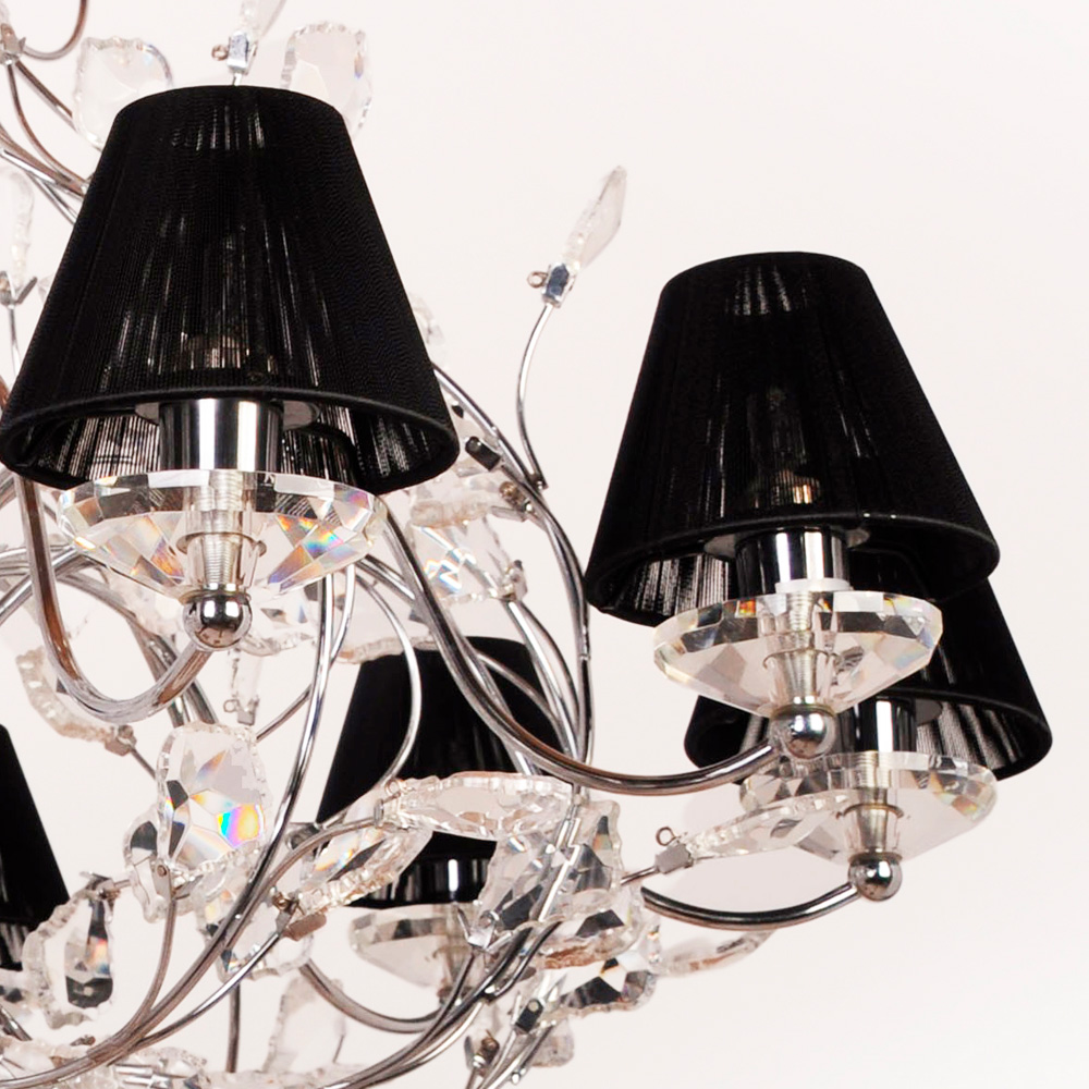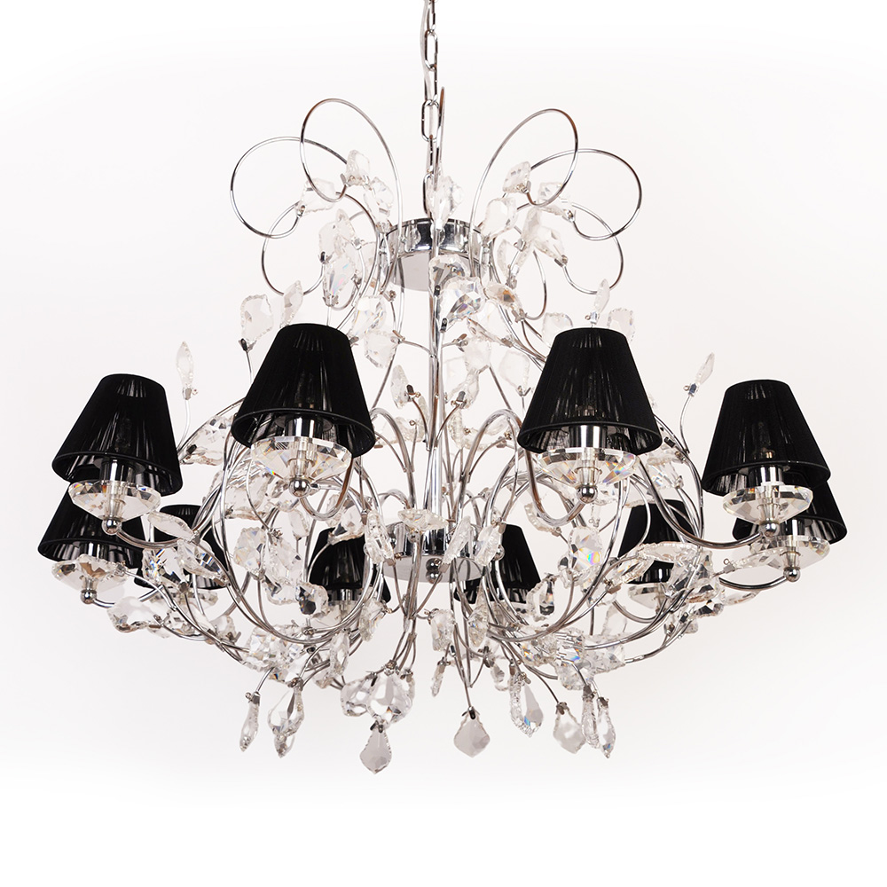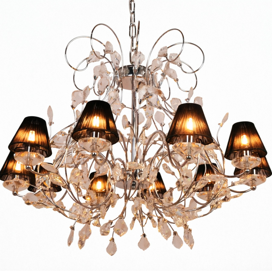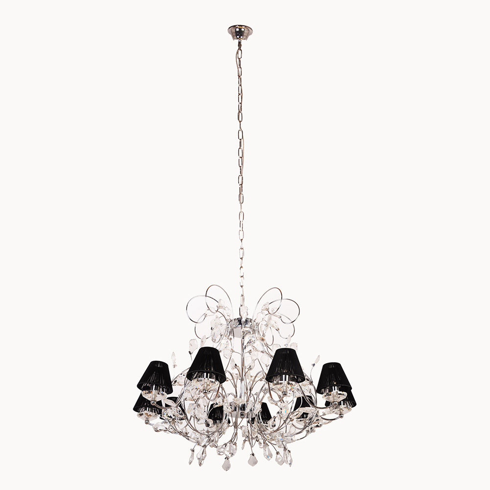 Подвесная люстра Doge Luce 190037 — это не просто источник света, а воплощение венецианской элегантности, застывшей в хрустале и металле. Эта роскошная подвесная конструкция словно соткана из лунного света и ночной тайны: десять изящных рожков, увенчанных глубокими черными абажурами из благородного текстиля, создают драматичный контраст с прозрачными хрустальными кристаллами, ниспадающими каскадом сверкающих капель.