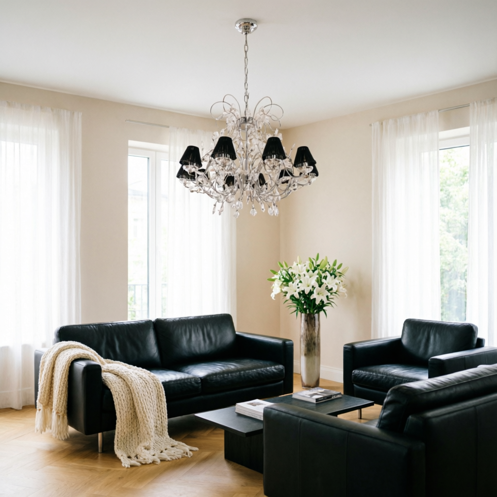 Черные абажуры не просто декоративный элемент — они направляют световой поток вниз, создавая интимное, камерное освещение, идеальное для обеденной зоны или гостиной площадью до 20 квадратных метров.