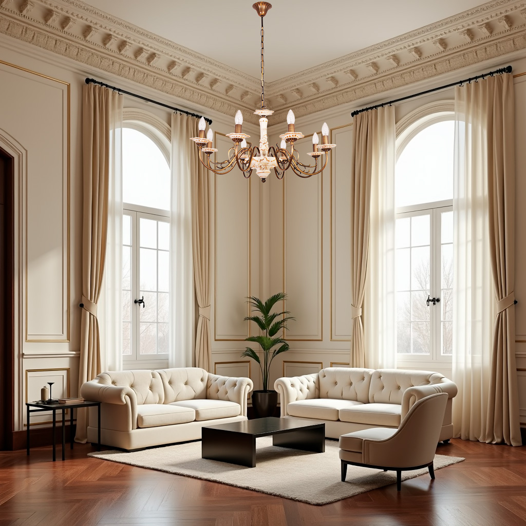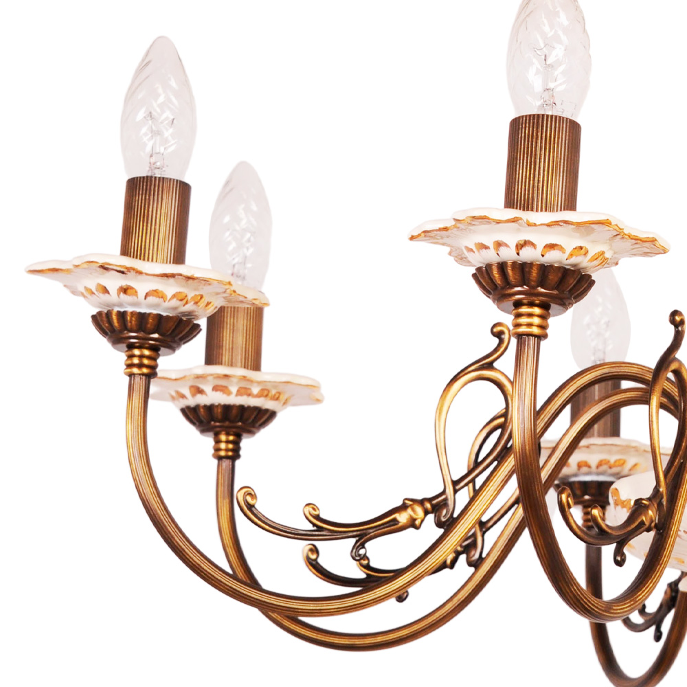 Восемь изящных плафонов, выполненных в форме мерцающих свечей, наполняют пространство мягким, рассеянным светом. Латунные элементы играют с бликами, а керамические чаши под патронами словно бутоны цветов, гармонично завершают эту композицию. Это та самая редкая красота, которая не подчиняется сиюминутным трендам, а задает вечные стандарты стиля. Площадь освещения 24 м² позволяет использовать эту люстру как центральный элемент гостиной, столовой или парадного холла.
