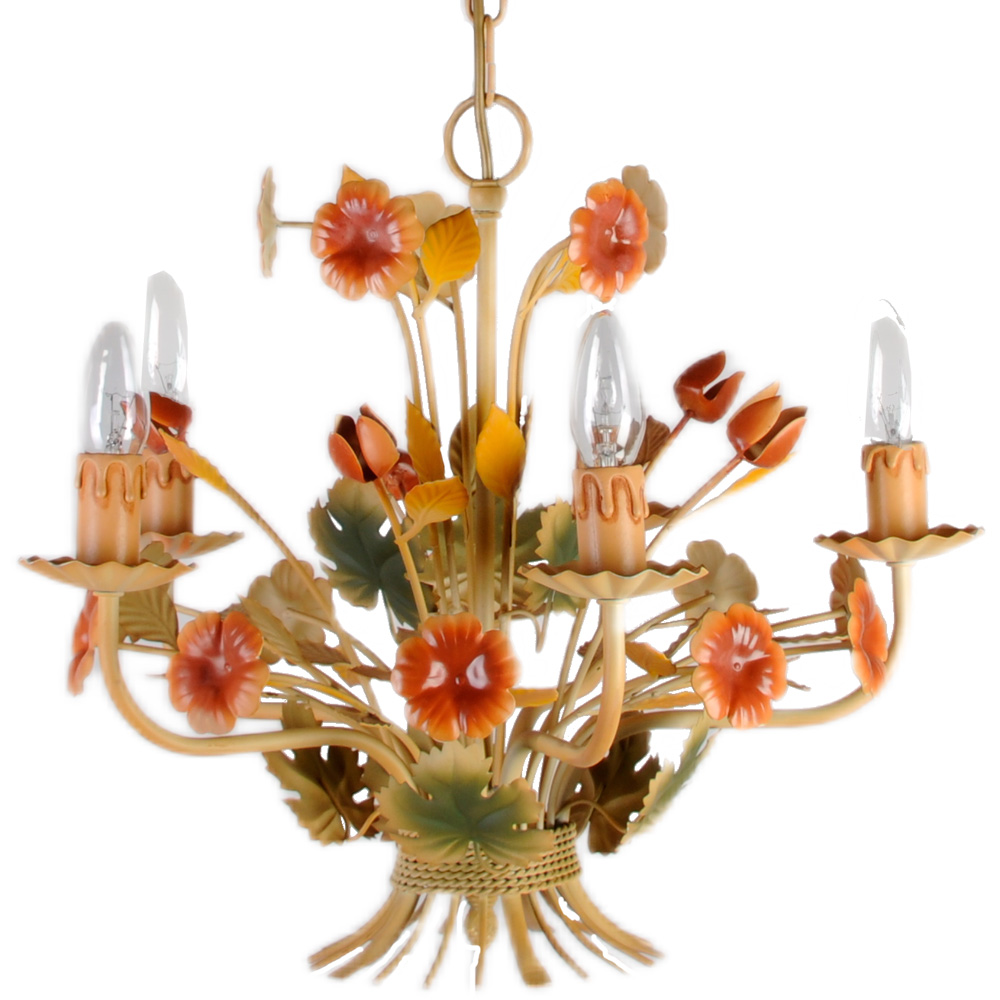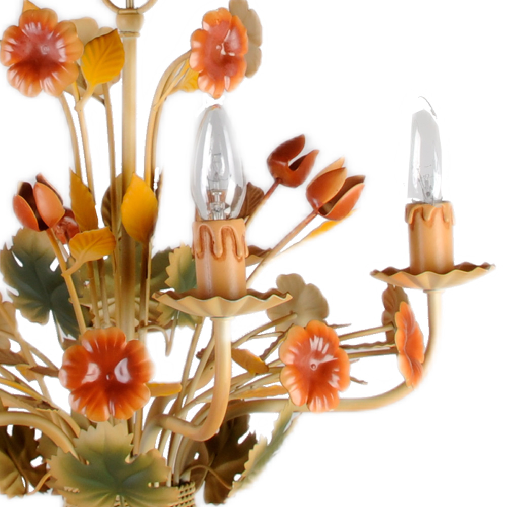 Мягкий, благородный свет струится из пяти изящных лампочек-свечей, которые словно светятся изнутри теплым солнечным нектаром. Но главное чудо скрыто в деталях: рассматривая люстру, вы открываете для себя целый ботанический сад. Ручная работа итальянских мастеров позволила создать невероятную игру красок — на кремовых ветвях распустились бутоны нежных оттенков спелой оранжевой охры и зелёные листья. Металлические листья и цветы словно только что освежены утренней росой, они переливаются и создают потрясающую объемность, заставляя свет играть в тенях.