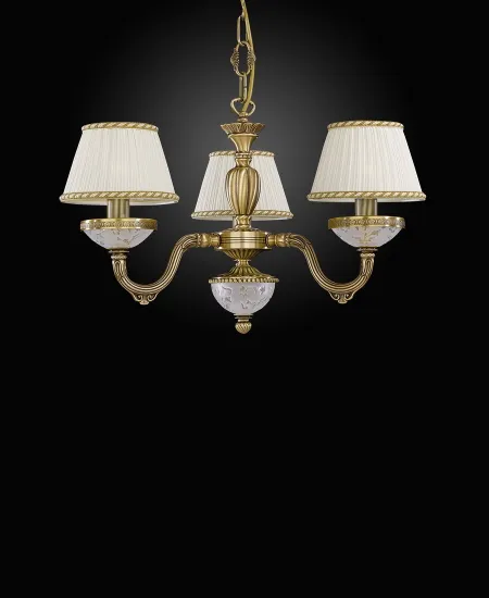 Корпус светильника изготовлен из латуни цвета античной бронзы, что добавляет изделию особую изысканность и гармонично вписывается в классический стиль интерьера. В основании каждого плафона — стеклянные матовые элементы с золотистым орнаментом, придающие люстре дополнительный акцент и изящество.