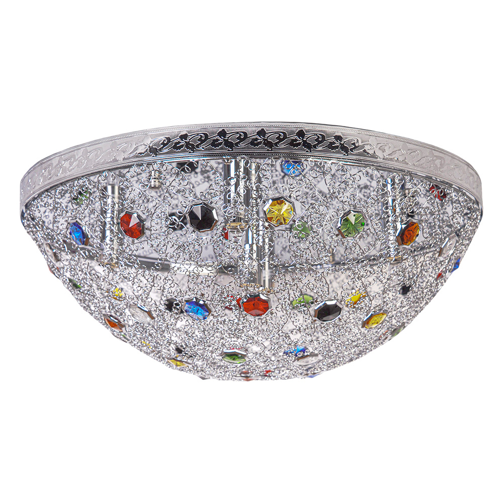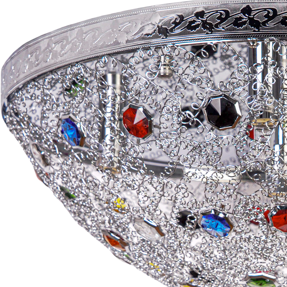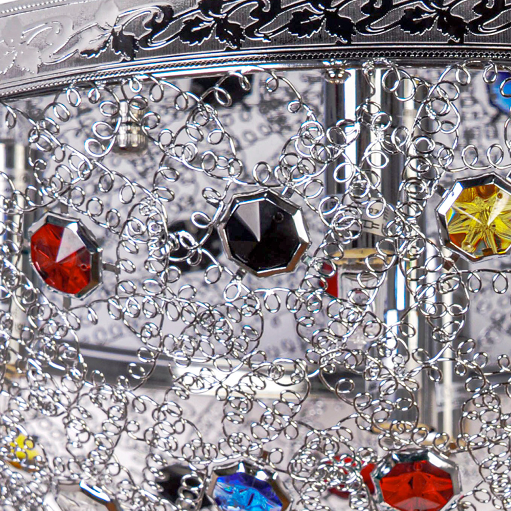 Её изящная полусфера, сплетенная из сияющего хромированного «кружева», становится источником мягкого рассеянного свечения. В сердцевине таится сокровище — композиция из многочисленных хрустальных кристаллов, которые, переливаясь и мерцая, наполняют комнату живыми бликами и радужными отсветами. Идеально подходя для освещения помещений до 15 м², эта люстра не просто выполняет свою функцию, но и становится ключевым элементом декора, объектом наслаждения и вечной ценностью, передающей ваш вкус через поколения.