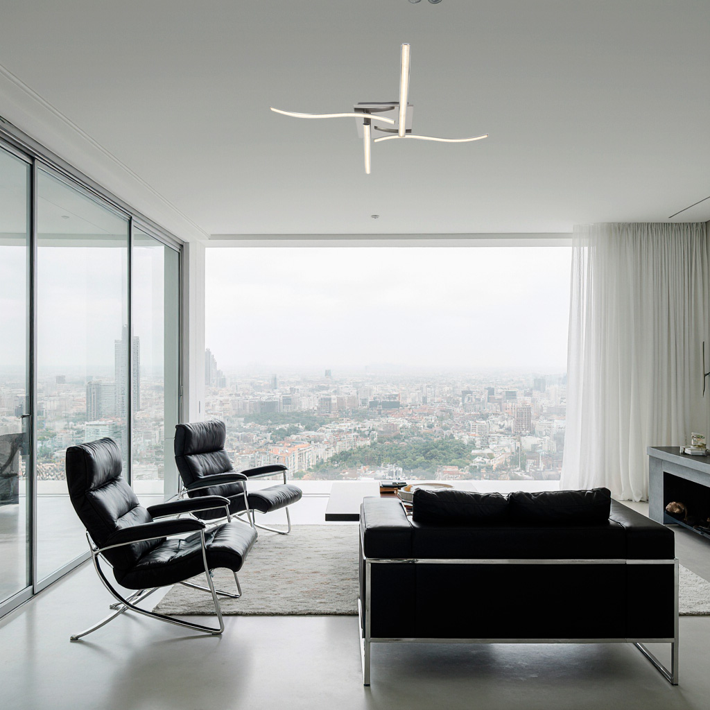 Глянцевый металл с хромированным покрытием играет роль благородного зеркала: он отражает окружающую обстановку, дробит свет на мягкие блики и визуально растворяет массивность конструкции, оставляя зрителю лишь ощущение невесомости и воздуха. Сами LED-стержни спроектированы так, чтобы свет не бил в глаза, а обволакивал помещение мягким, рассеянным сиянием, стирая границы между светильником и потолком.