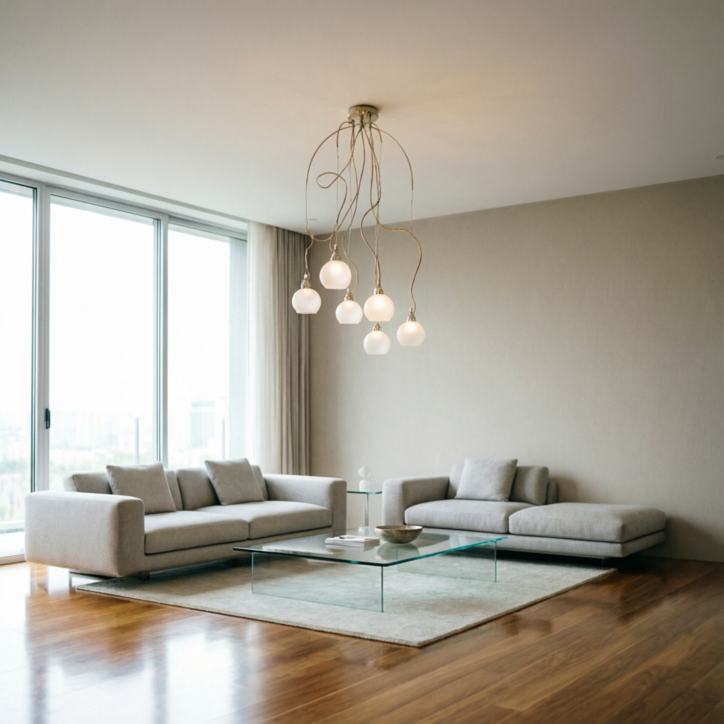 Матовые стеклянные плафоны, похожие на капли утренней росы, не слепят, а бережно рассеивают свет, превращая его в теплый, полумрак, в котором хочется щуриться от удовольствия. Шесть независимых источников света (общая площадь освещения — 18 м²) мягко обволакивают каждый сантиметр гостиной или спальни, создавая эффект «объятий».