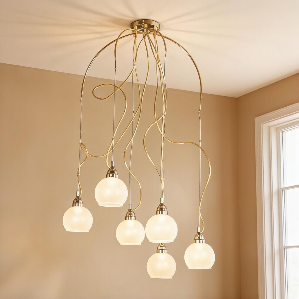 Представьте: вы входите в комнату, и первое, что приковывает взгляд — это изящный светящийся силуэт, парящий под потолком. Потолочная люстра Doge Luce 200100 — это не просто источник света, это архитектура воздуха, сплетенная из золотых струн и серебристого металла.