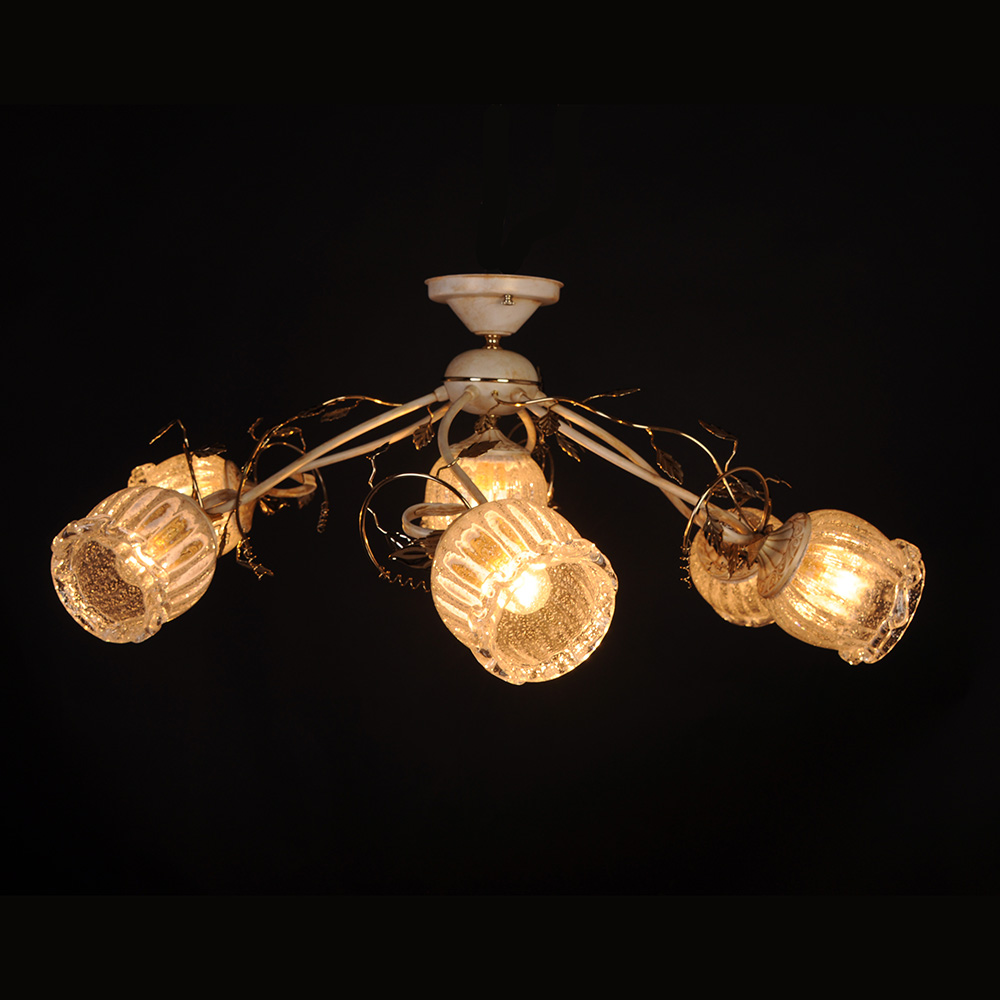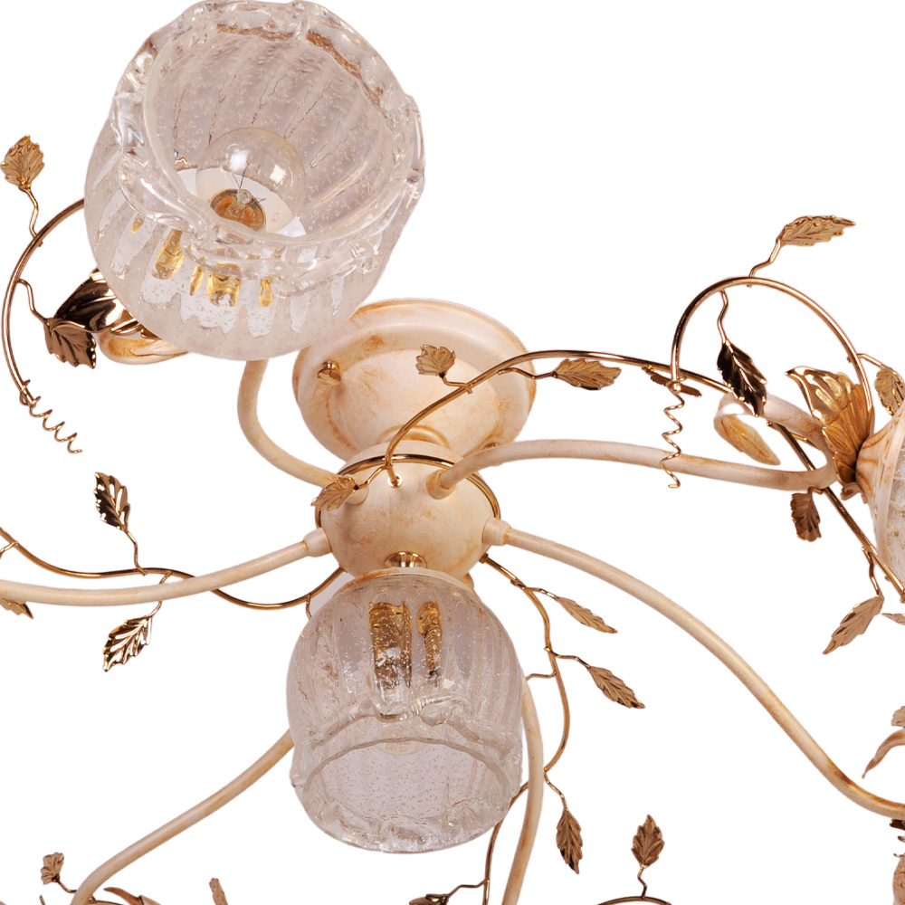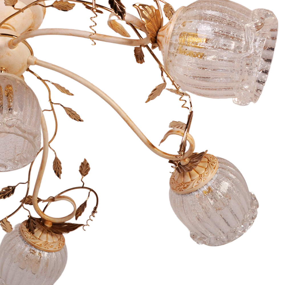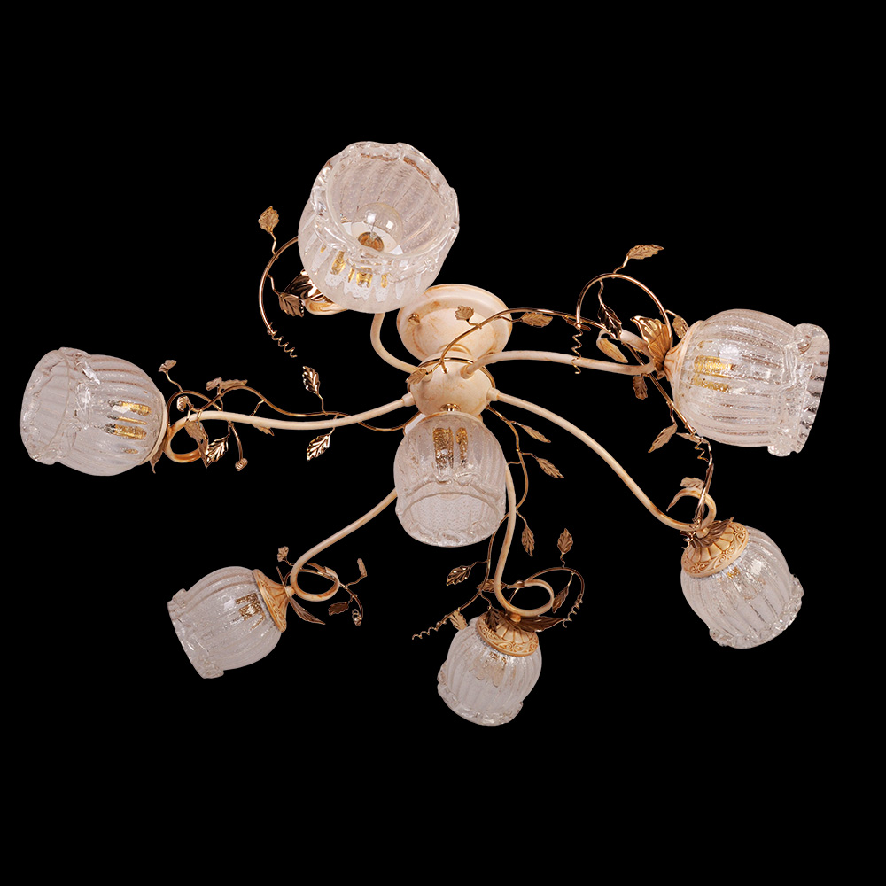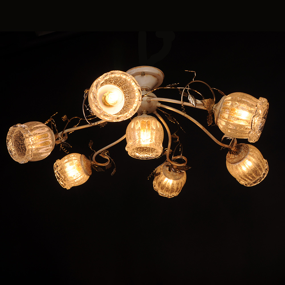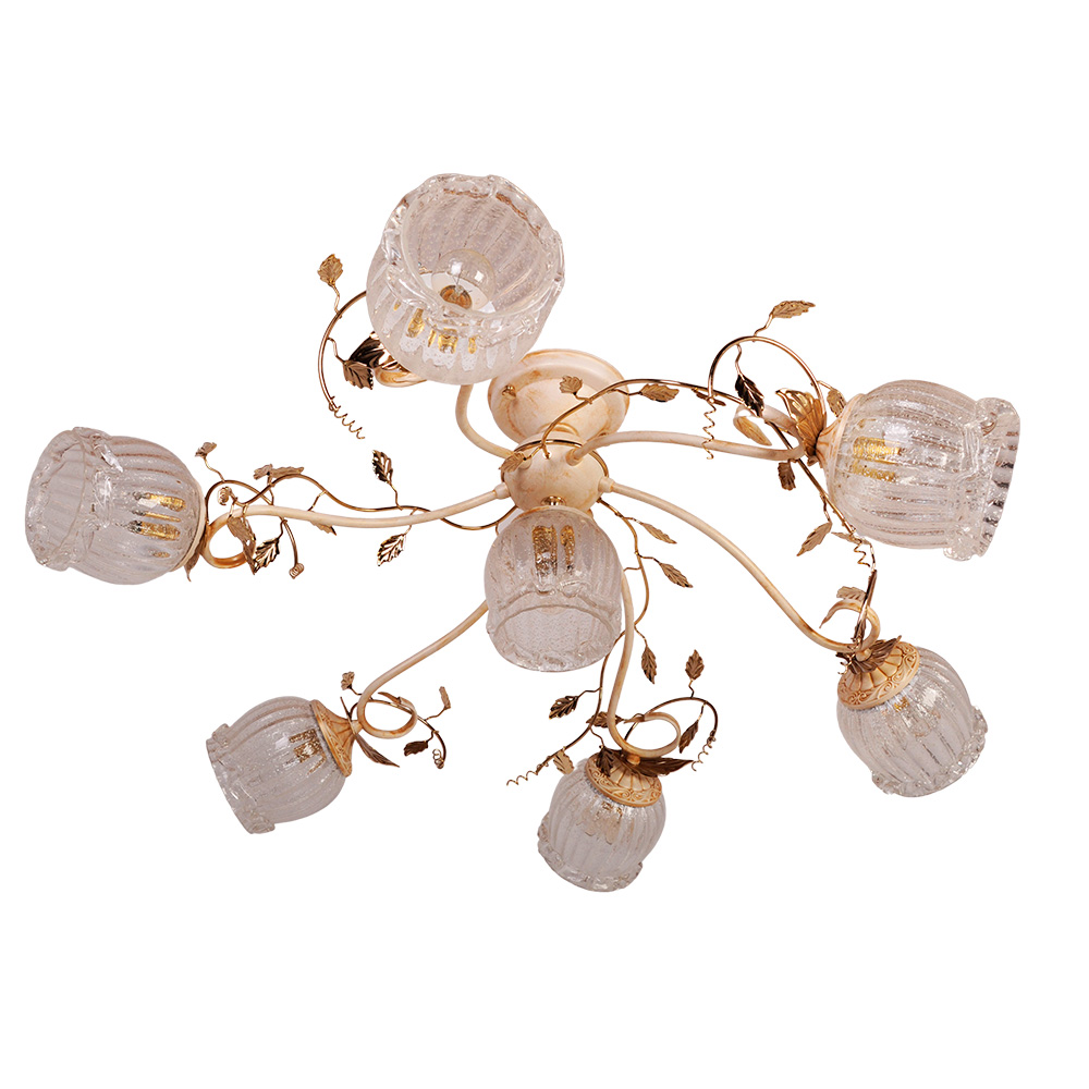 Особого внимания заслуживает внимание к деталям: золотистые ветви украшены тонкой гравировкой и миниатюрными декоративными листьями, которые переливаются в свете ламп, делая композицию объемной и реалистичной. Свет семи ламп, проходя сквозь рифленое стекло, теряет свою резкость, становясь мягким и обволакивающим. Он словно струится сквозь листву, наполняя комнату теплом и покоем.