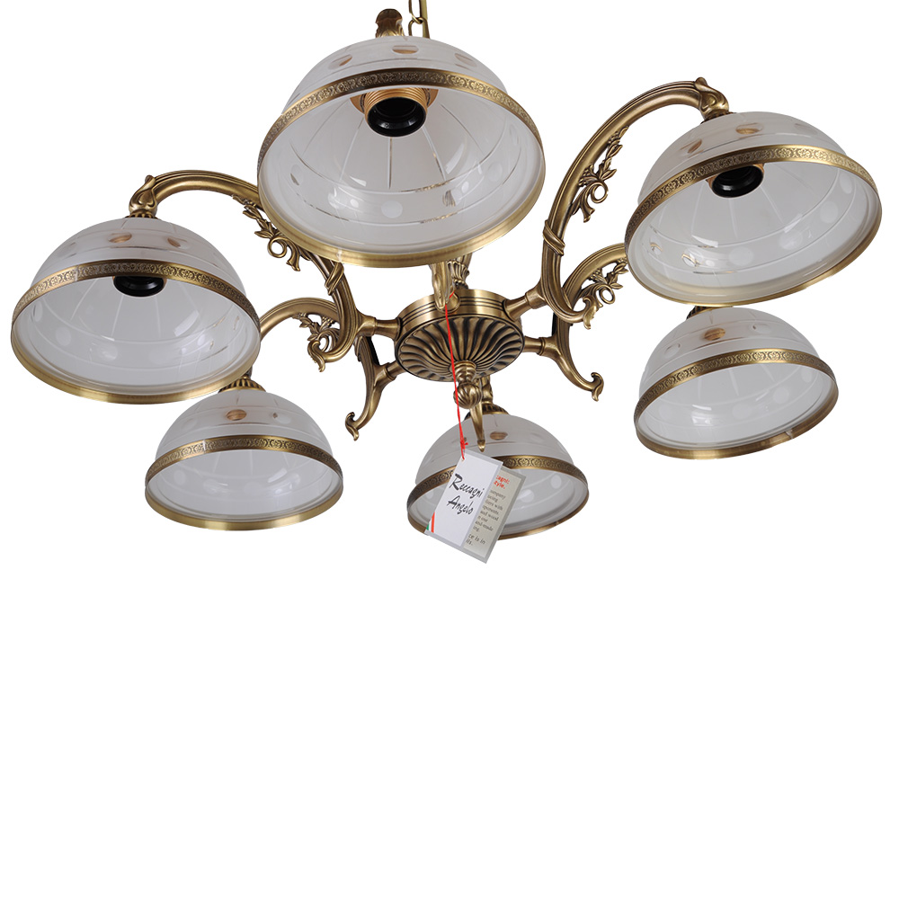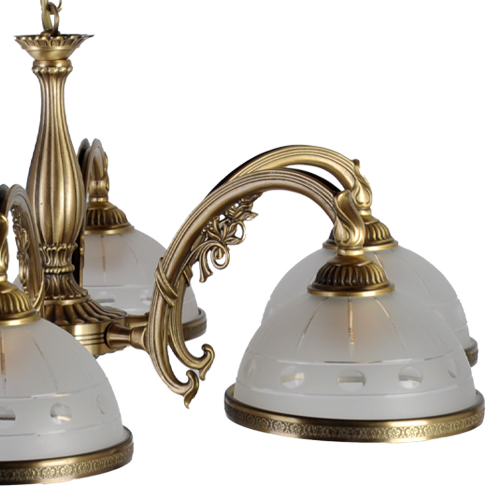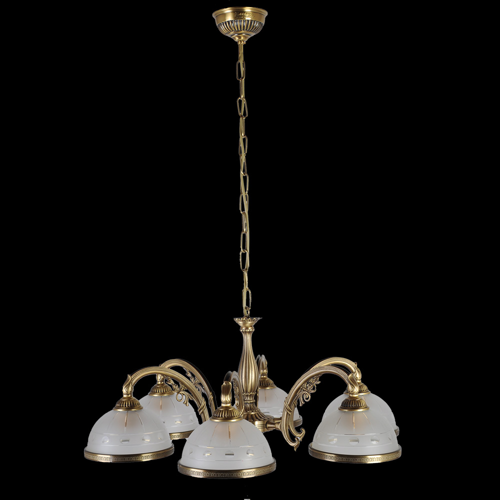 Главное богатство этой люстры — благородный материал. Каркас и декоративные элементы выполнены из латуни с покрытием цвета бронзы. Теплый металлический оттенок придает изделию основательность и визуальную роскошь, а со временем латунь лишь становится благороднее, обретая мягкое сияние антиквариата. Конструкция продумана до мелочей: центральная часть оформлена в виде изящной цепочки из мелких звеньев, создающей ощущение легкости и воздушности. От нее отходят шесть плавно изогнутых металлических дуг, каждая из которых поддерживает плафон. Эти дуги напоминают изящные завитки — традиционный элемент старинных светильников, придающий люстре особый шарм.