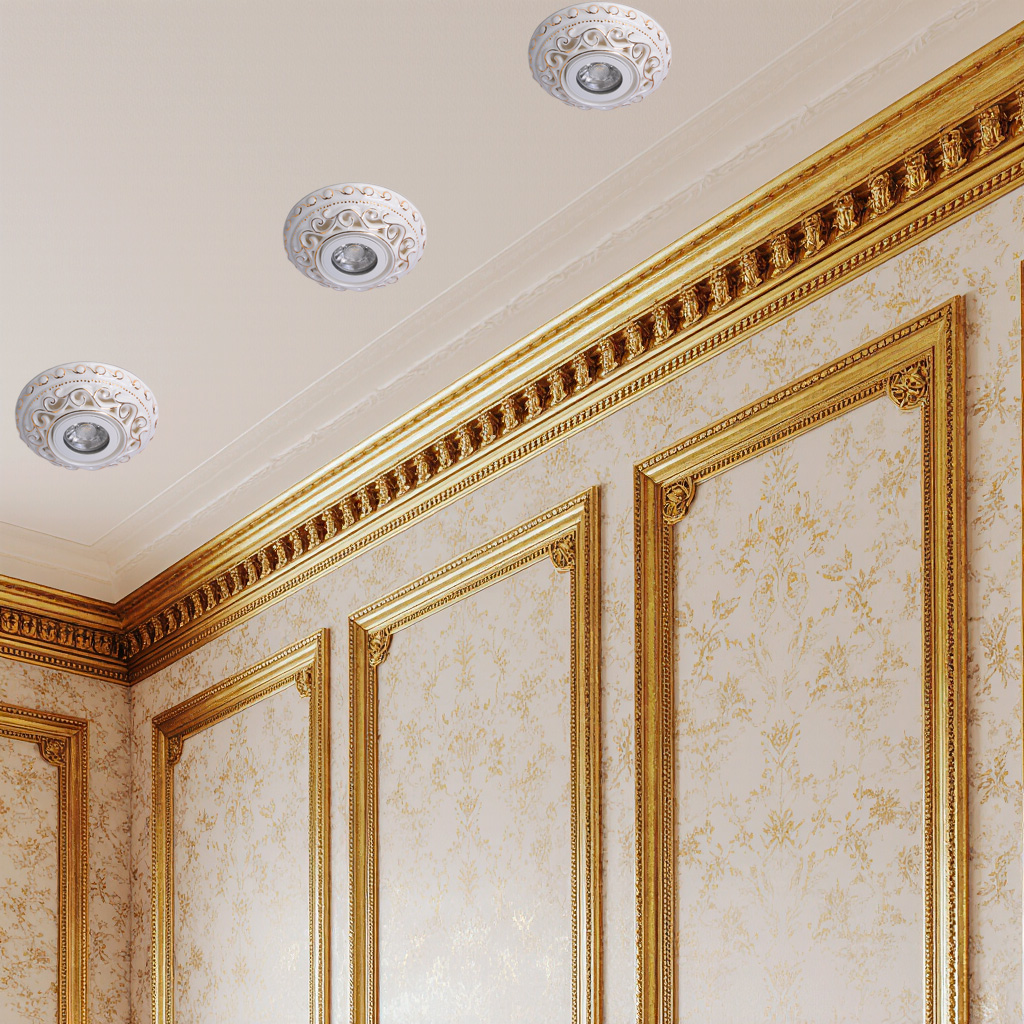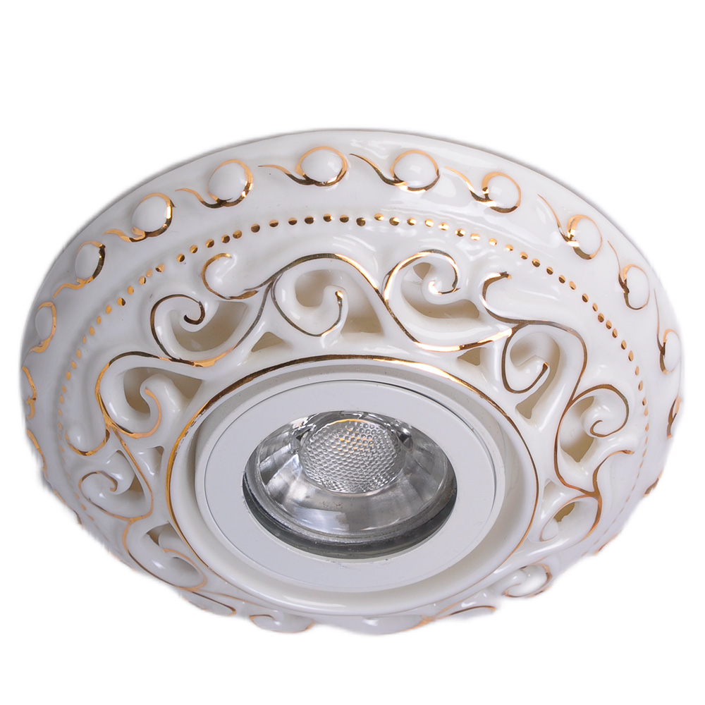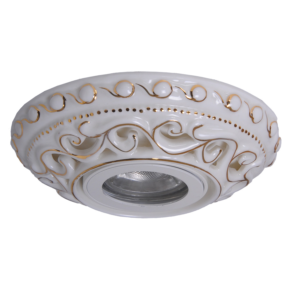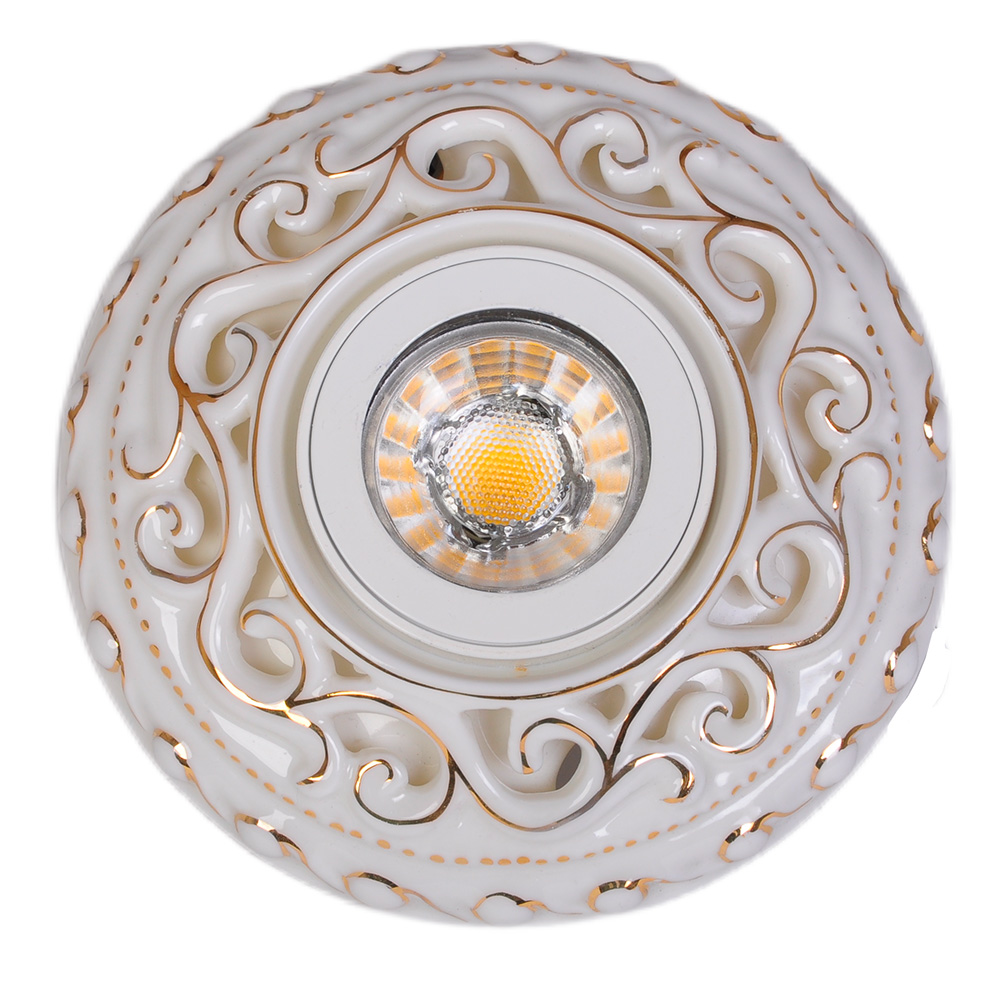 Его идеально круглая форма диаметром 12 см, выполненная в благородной белой керамике, говорит о безупречном вкусе и внимании к деталям. Но истинная магия раскрывается в деталях: тонкая золотистая окантовка, словно солнечный ободок, обрамляет спот, а в её обрамлении расцветают изящные растительные узоры. Каждый завиток, выполненный в золоте, — это ручная работа классического декора, создающая игру света и тени даже при выключенном свете.